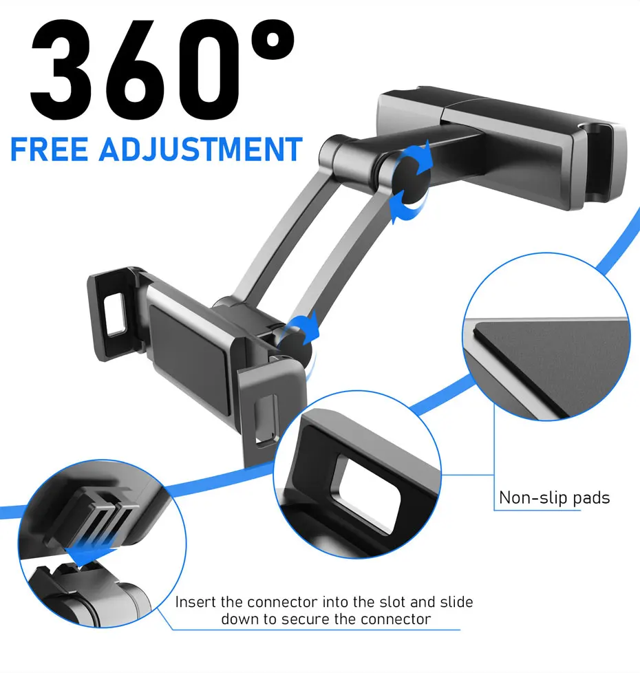 【Вращающийся на 360 ° и простая установка 】 автомобильный держатель планшета вращается на 360 градусов, позволяет регулировать ваш iPad под любым наилучшим углом обзора. Просто нажмите на крепление подголовника между задним сиденьем.