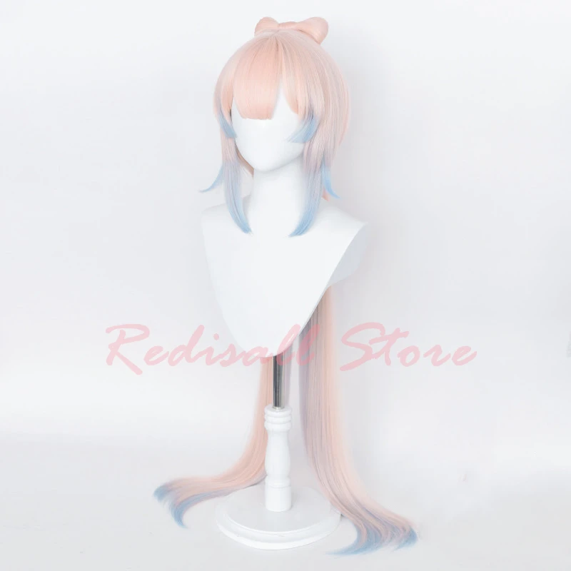 Парик для косплея Genshin Impact Kokomi с бантом и хвостом, 120 см, длинные прямые волосы, Смешанные розовые и синие термостойкие синтетические игры для ролевых игр