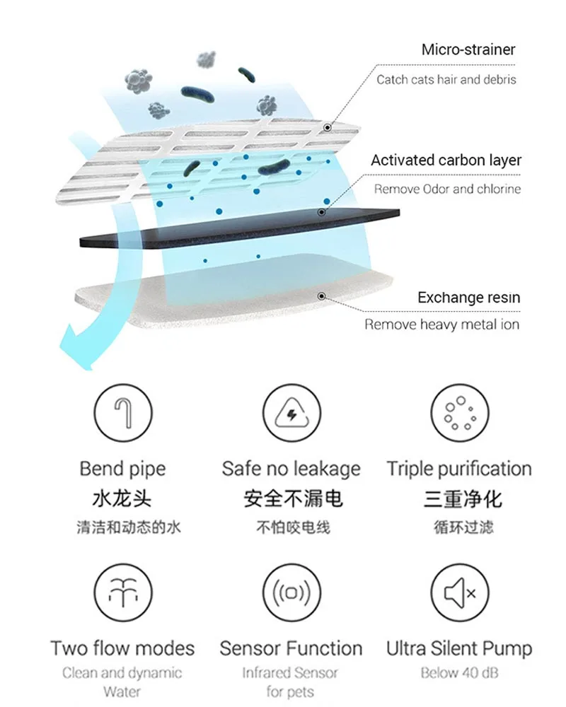 Название продукта: фонтан для домашних животных и кошекМатериал: пластикЦветовая температура: синий, белыйТип 1: с датчиком диспенсер для воды автоматически запускается, когда питомец находится рядом, и автоматически выключается, когда нет помехТип 2: без датчикаФункция: фильтрация примесей воды, 2 режима потока воды, циркуляционный поток водыПитание: подключаемый адаптер или функция внешнего аккумулятора USBПодходит для: кошек и щенковЕмкость: 1,8 лРазмер: тело 16,5 см * Ш 15 смПосылка входит: 1 кошачий фонтан + адаптер