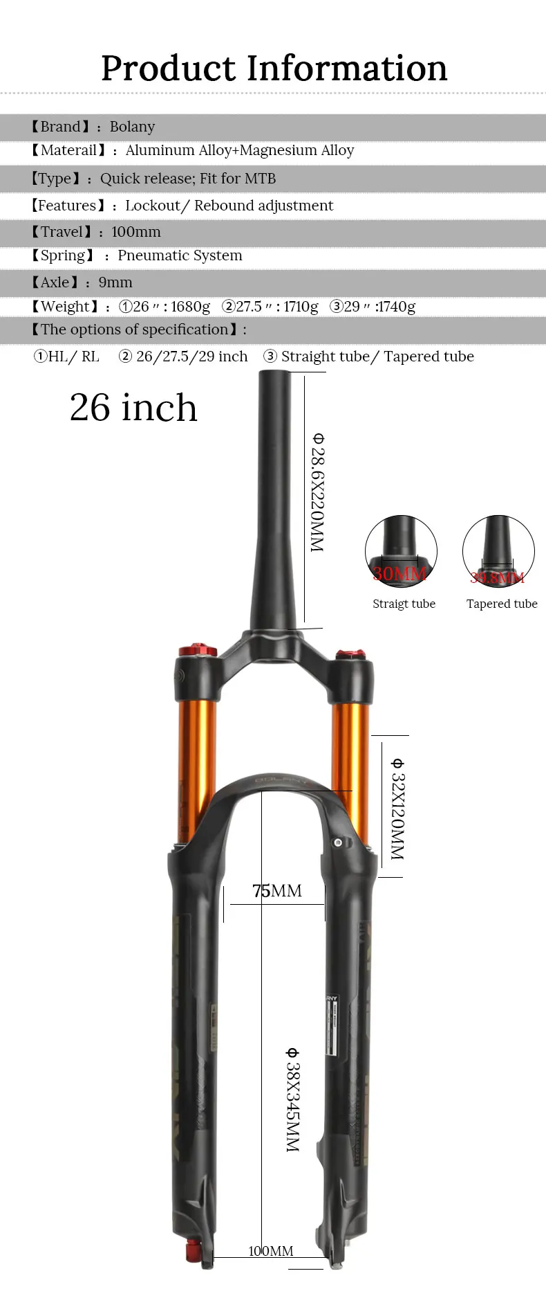 Воздушная вилка Bolany для горного велосипеда, регулировка отскока, прямая коническая горная вилка с замком 2627, 529, Аксессуары для велосипеда