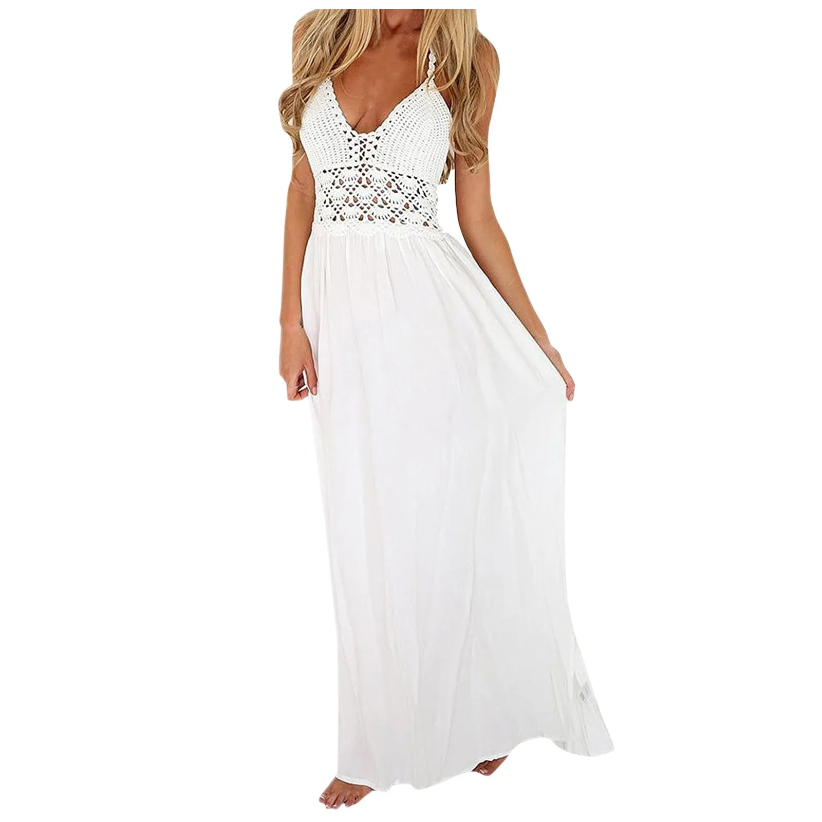 Богемные женские вечерние платья с открытой спиной, белое кружевное пляжное платье, сарафан с лямкой на шее, бандажные вечерние платья макси
