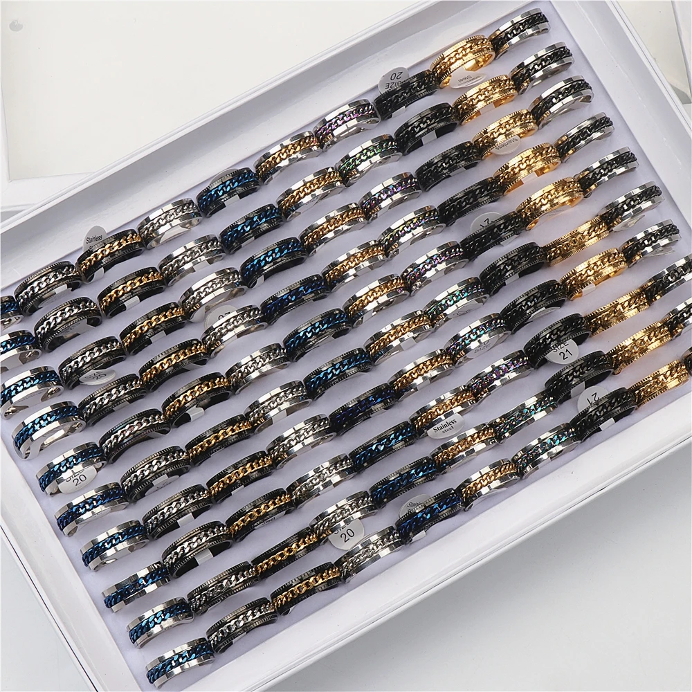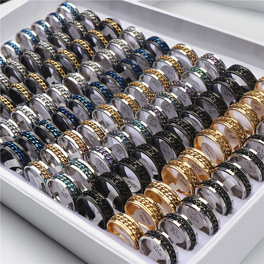 50 шт./лот Спиннер кольца из нержавеющей сталиМатериал: нержавеющая стальРазмер: от 17 мм до 21 мм размер США от 7 до 11Количество: 50 шт./лотСтиль: смешанный стиль, Случайная ДоставкаОсобенности: различные стили и цветаПреимущество: не выцветаетПовод вечерние, ежедневно, подарок, свадьбаУпаковка: полиэтиленовый пакет, коробка в комплект не входитВес: около 7 г