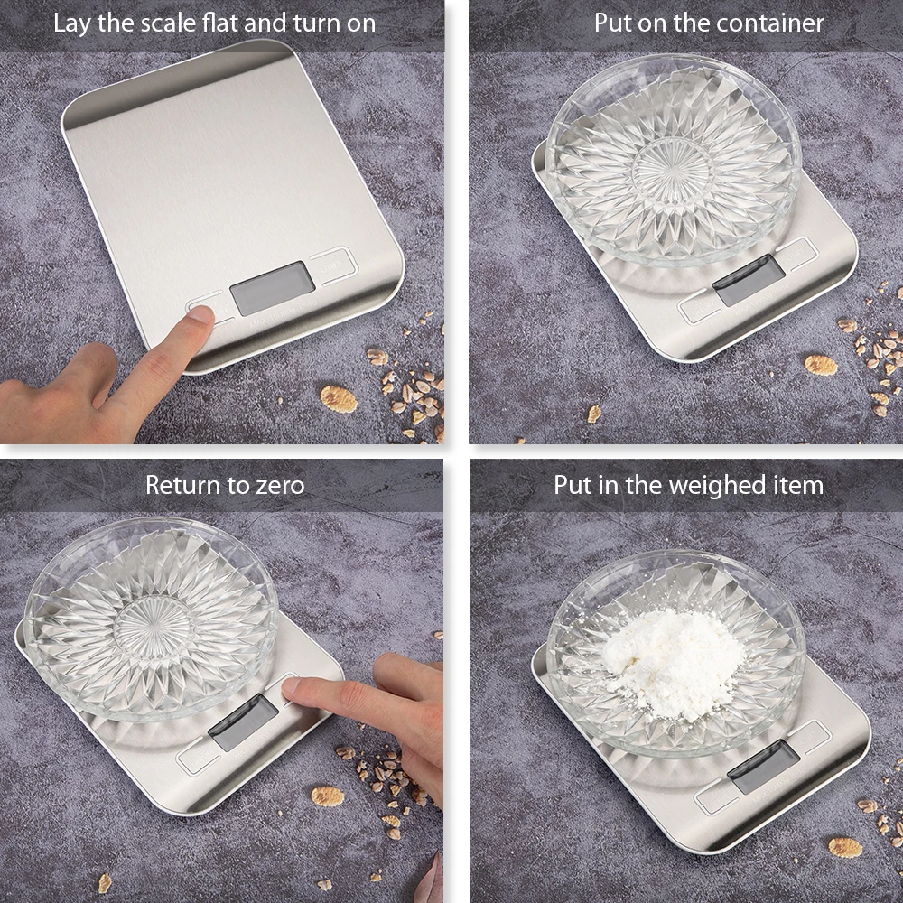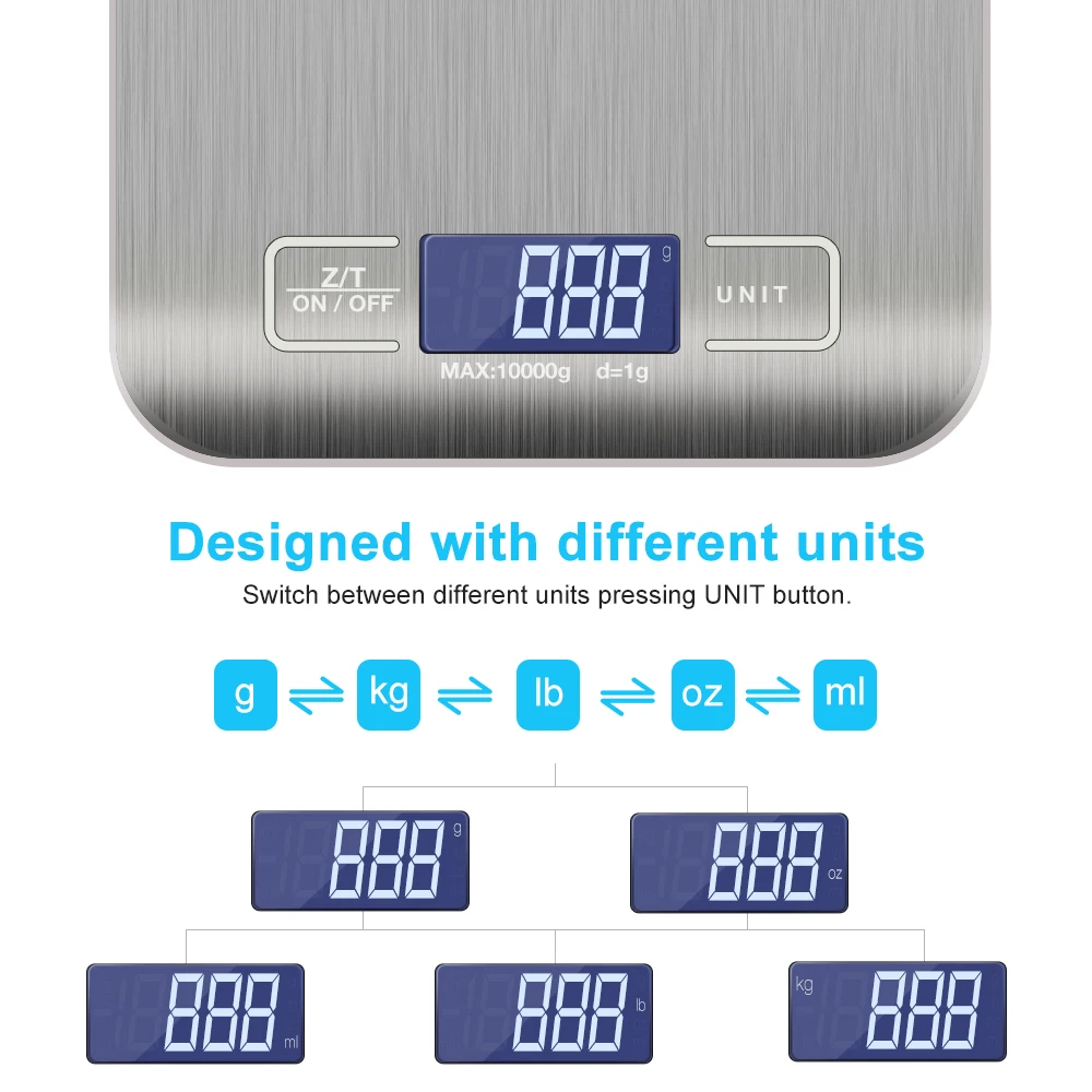 Кухонные весы изготовлены из нержавеющей стали и АБС-стойкого к коррозии пластика. Водонепроницаемый и грязеотталкивающий, простой в использовании. Цифровые весы подходят для дома и кухни, используются для взвешивания муки, фруктов, оборудования, китайской медицины, ювелирных изделий и т. д. сильная функциональность, подходит для различных сценариев. Это хороший помощник для семейной работы.