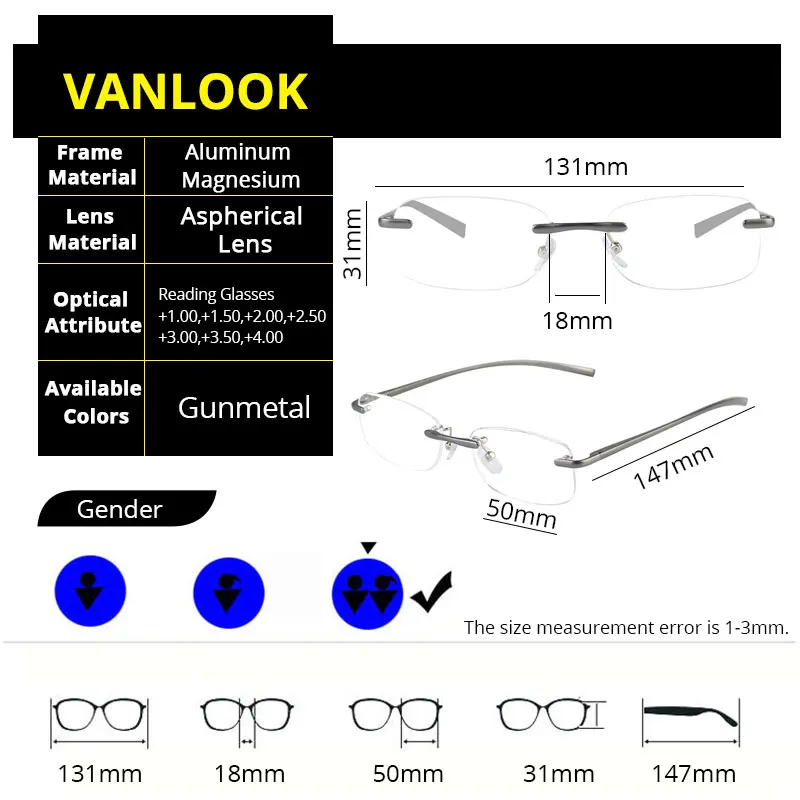 VANLOOK женские очки для чтения без оправы Мужские квадратные оправы из алюминия и магния оправы для очков весенние бескаркасные пресбиопические очки