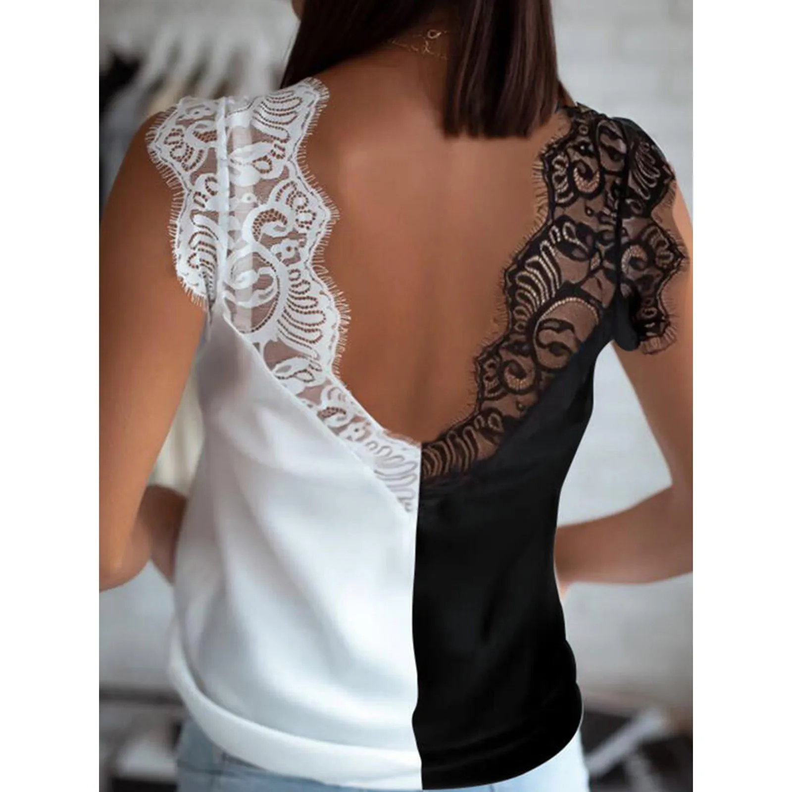 Модный контрастный шифоновый женский топ, кружевная Сексуальная майка с глубоким V-образным вырезом, Женская длинная футболка без рукавов, новинка, жилет, женская одежда