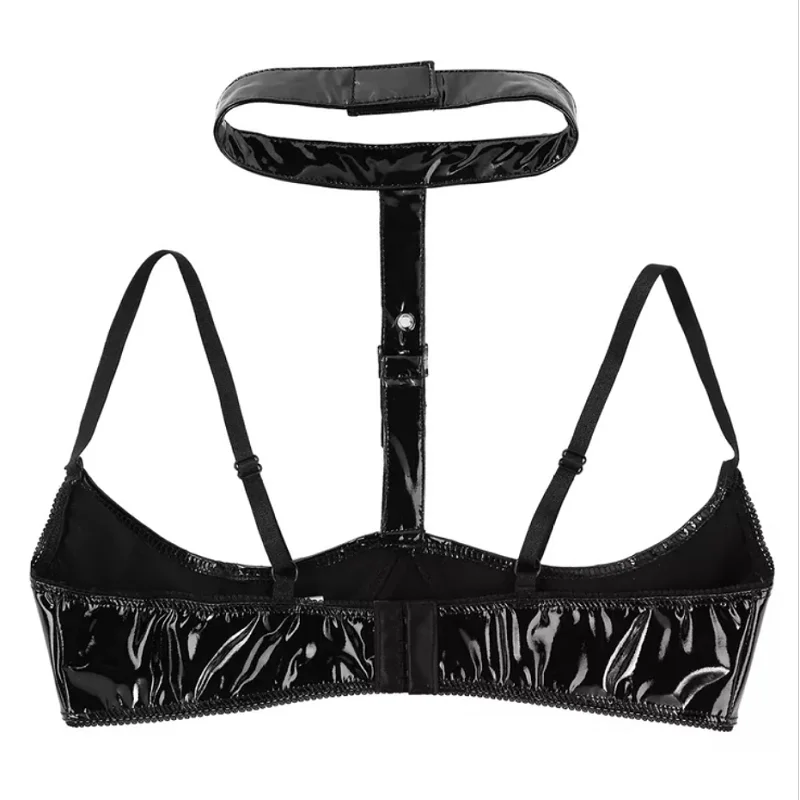 Женский сексуальный глянцевый кожаный бюстгальтер с открытой чашкой для секса на спине Регулируемый эротический горячий порно экспозиция груди Блестящий латексный бюстгальтер на шею топы для секса