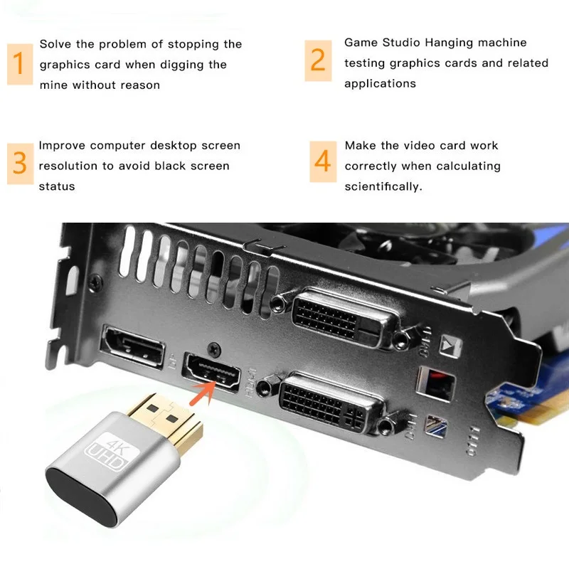Hdmi-совместимый виртуальный дисплей по умолчанию рекомендуется 1920*1080 @ 60 Гц, до 4K(3840*2160)@ 60 Гц, требуется поддержка HDMI-compatible2.0, а именно RX460 и GTX1050 или более видеокарт.Описание:Этот вид продукта относится к продукту, который работает 24 часа непрерывно и принадлежит к расходному продукту.Функция:Основная функция этого продукта заключается в имитации дисплея, основные цели: