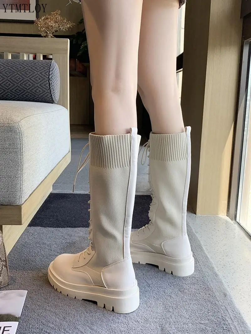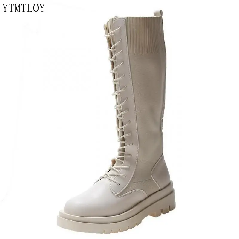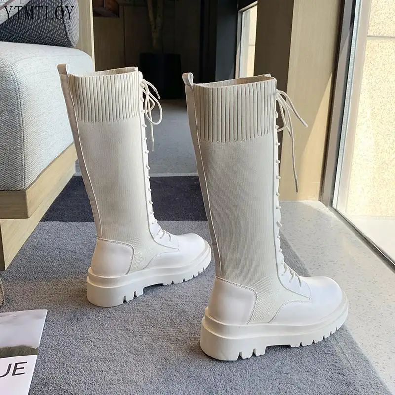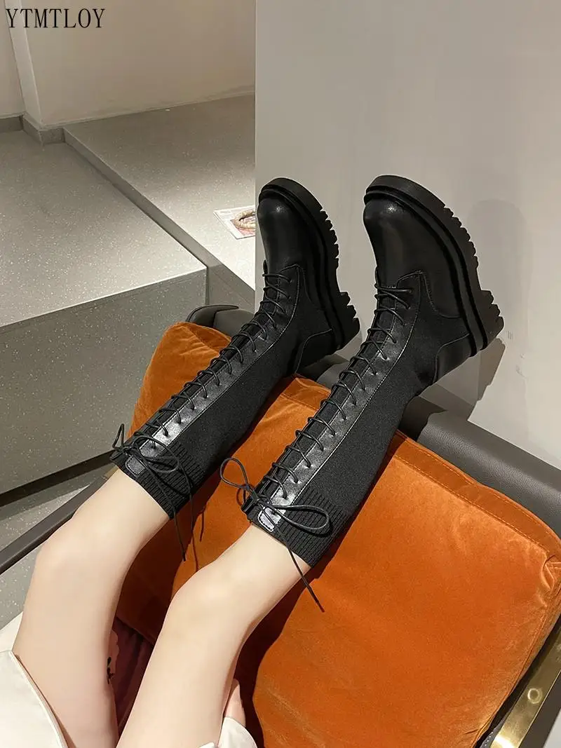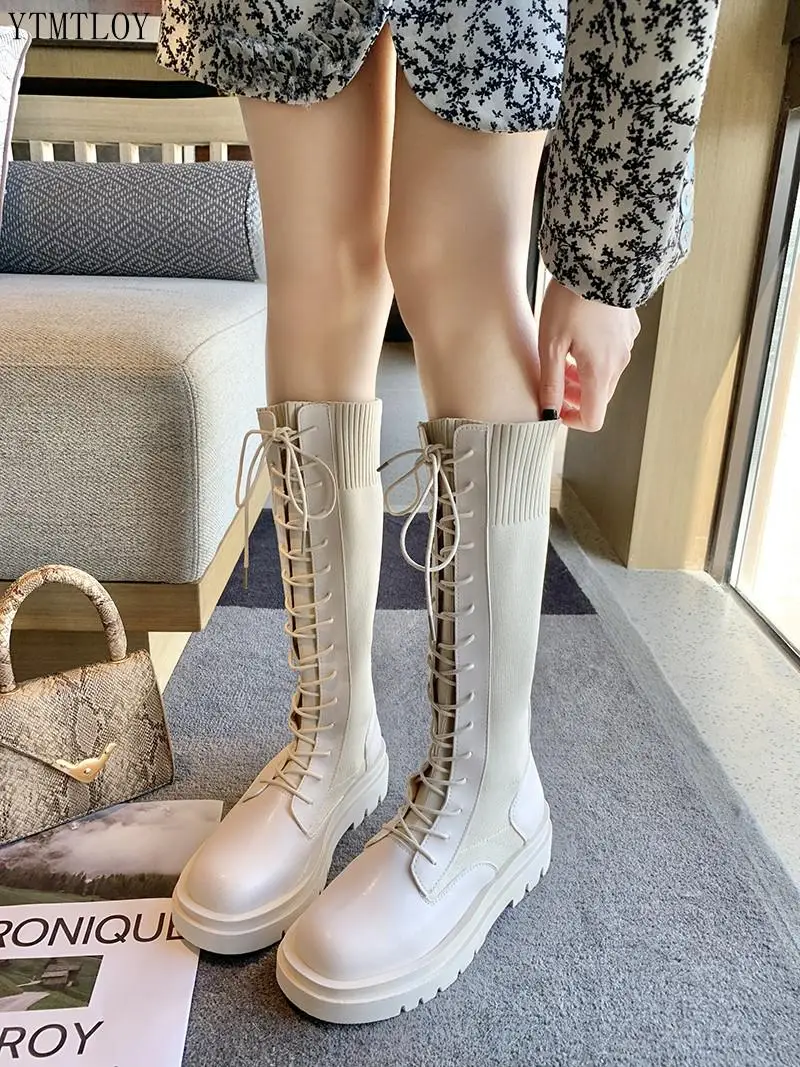 Женские осенние высокие сапоги до колена из искусственной кожи на шнуровке и толстой подошве