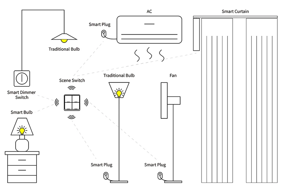 Просто нажмите переключатель сцены один раз, чтобы включить все огни, кондиционеры, вентиляторы и другие связанные смарт-устройства, которые вы хотите, когда arraive home