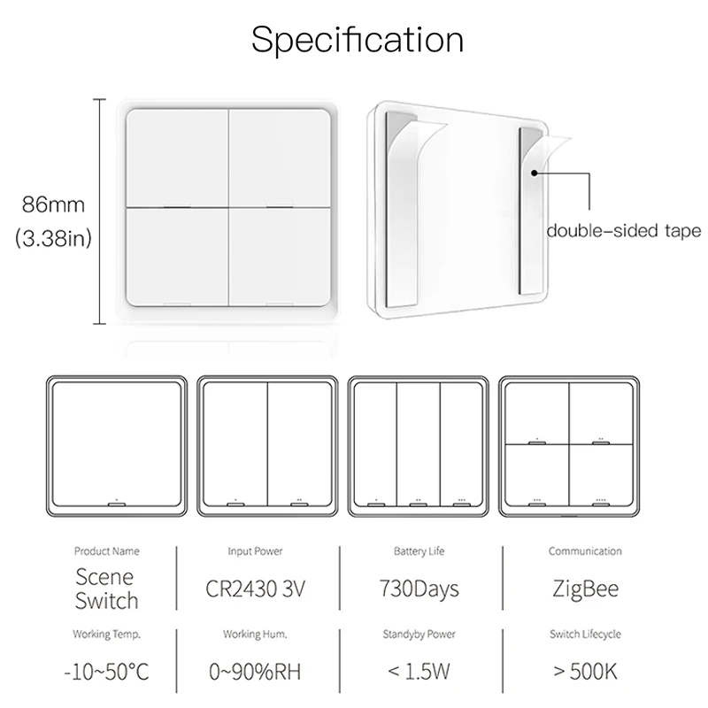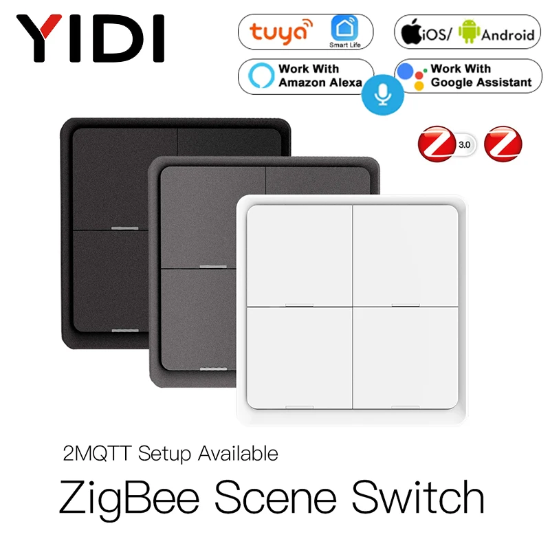 YIDI ZigBee 3,0 Tuya Smart Сцена кнопочный переключатель приведенный в действие Батарея, 1/2/3/4 Gang 3, 6, 9, 12, сцены сценарий автоматизации Беспроводной настенный выключатель для Tuya Smart устройств Основные характеристики: 1. Установите различные сцены для умных устройств: Подключите сцену к умным устройствам tuya через приложение smart life или tuya для установки сцен; Нажмите-to-run, чтобы получить еще один более легкий контроль для всех смарт-устройств tuya с одной клавишей на переключателе; Каждая кнопка переключения может реализовывать различные сцены. 2. 4 группы 12 сцен: Три режима сопряжения для каждой кнопки для достижения 12 сцен от одного 4 переключателя сцен, таких как режим вдали, домашний режим, режим кино и т. Д. Чтобы создать любую интеллектуальную автоматизацию, как вы хотите, в вашем смартфоне, чтобы начать другой Интеллектуальный стиль жизни, больше нет голосовой команды, нет больше времени, чтобы открыть приложение, требуется только одно касание. 3. Компактный Магнитный дизайн: Это беспроводной настенный выключатель при подключении к стене. Когда не прилагается, это пульт дистанционного управления. Можно удобно носить на балкон, спальни, кухни, кабинета, и многое другое Благодаря компактному размеру с толщиной всего 1,3 см. 4. Используется в различных сценах с умными устройствами: Ускорьте время отклика смарт-устройства; Обеспечивая более плавное управление, удалите зависимости только от сети Wi-Fi. 5. Простота в использовании и установке: Можно зафиксировать в любом месте с помощью двусторонней ленты; Низкое энергопотребление с 730 дневным сроком службы батареи; Нет необходимости в проводке; Мы создаем несколько систем управления для быстрой и легкой модернизации. Примечание: Концентратор ZigBee необходим для добавления смарт-устройства к переключателю сцены. Следует связать с другими смарт-устройствами tuya и не использовать отдельно без смарт-устройств tuya. Параметр: Входная мощность: CR2430 3В (аккумулятор не прилагаются) Размер: 86*86*13 мм Срок службы батареи: 730 дней Коммуникация: ZigBee Рабочая температура: -10 ℃ ~ 50 ℃ Рабочая влажность: 0-90% относительной влажности В режиме ожидания Мощность по уровню поверхности: <1,5 W Жизненный цикл: > 500K Приложение: Tuya / Smart Life Упаковочный лист: Беспроводной сценический переключатель * 1 (аккумулятор не входит в комплект) + руководство * 1 + наклейка * 2