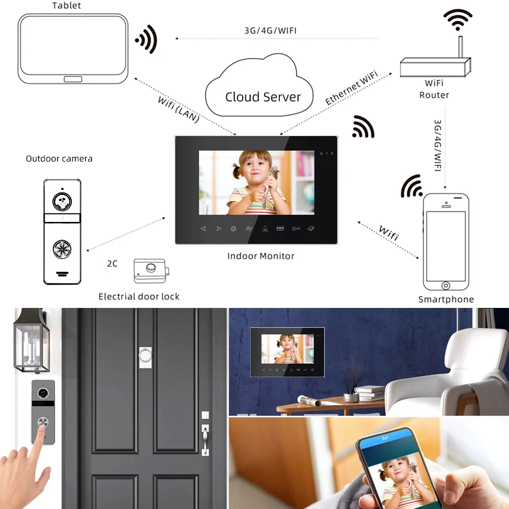 * 7 дюймов полный сенсорный экран, можно легко подключить 2 наружные устройства * Беспроводное подключение Wi-Fi к смартфону, пожалуйста, установите ip-дверной звонок приложения * Подключите монитор к домашнему wifi или сети, если вам нужно подключить к смартфону * Приложение управления в реальном времени, 2 способ обсуждения, разблокировать, запись видео с обувью/изображений * Поддержка разблокировки электрического замка, поддержка подключения различных электрических замков * Экран может использоваться как часы * После успешного подключения, вы можете поговорить с посетителем и разблокировать Электрический замок