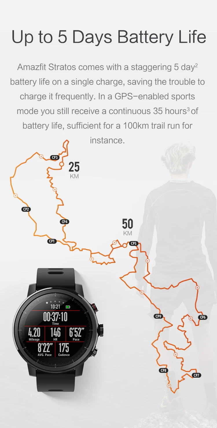 Сверхдлительное время работы в режиме ожидания до 5 дней в обычной ситуации, что позволяет избежать частых проблем с зарядкой. Если используется Полный режим движения GPS, непрерывное использование времени может достигать 35 часов, оно полностью может завершить гонку по пересеченной местности в ста километрах.