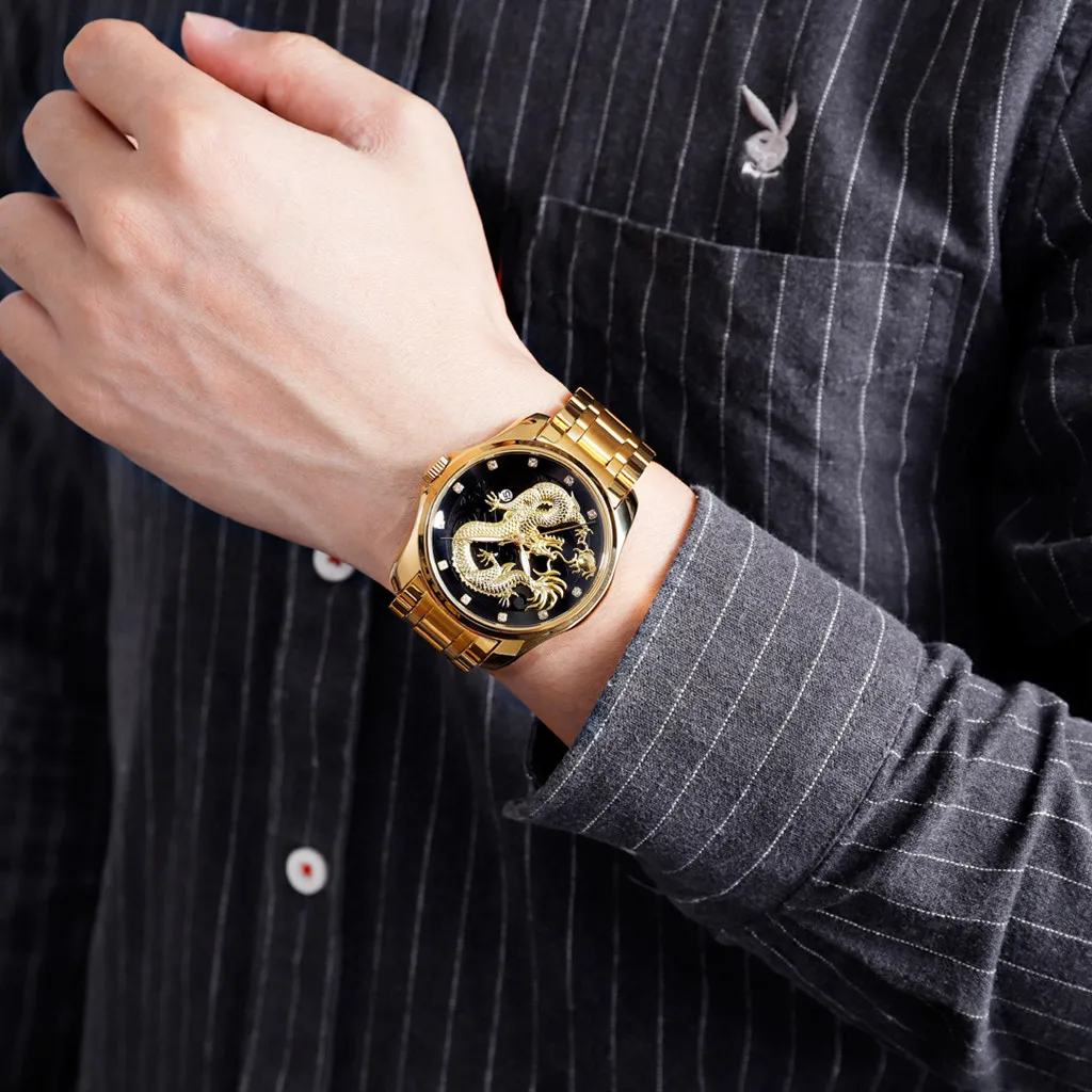 Мужские водонепроницаемые кварцевые часы с календарем и золотым Драконом