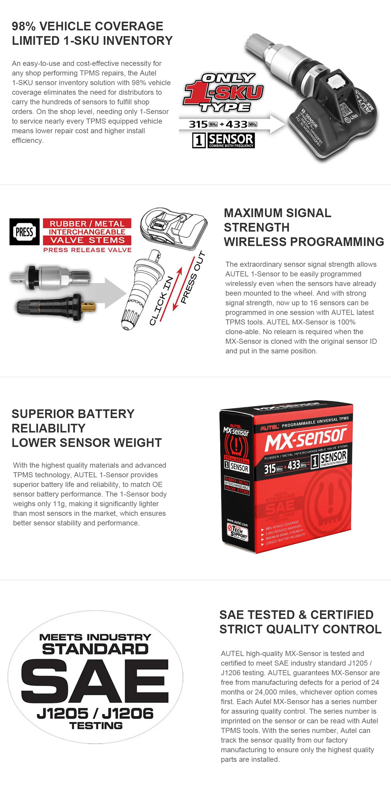 315 315 МГц и 433 МГц 2 в 1 】:Этот датчик контроля давления в шинах (для TPMS) было изготовлено для комбинирования как 315 МГц, так и 433 МГц приложений в одном датчике, чтобы обслуживать почти каждый TPMS оборудованный автомобиль для снижения стоимости ремонта и иметь более высокую эффективность установки без необходимости повторного обучения. MX-Sensor является 100% cloneable с оригинальным идентификатором датчика и помещается в том же положении.【 98% Coverage】:Датчик Autel 1-SKU имеет долгую способность покрывать более 98% всех OE датчиков на рынке, чтобы поддерживать до 90% североамериканских, европейских и азиатских брендов.【Легко использовать 】:Максимальная сила сигнала датчика позволяет легко программировать датчики по беспроводной сети, даже когда они уже установлены на колесо. Кроме того, уникальная конструкция клапана с пресс-релизом делает замену ручного датчика намного проще.【Твердый и прочный 】:С высококачественными материалами и передовой технологией TPMS, AUTEL 1-Sensor обеспечивает превосходный Срок службы батареи и надежность, чтобы соответствовать производительности батареи OE sensor. Корпус с 1 датчиком весит всего 11 г, что делает его значительно легче, чем большинство сенсоров на рынке, что обеспечивает лучшую стабильность и производительность датчика.【Беспроводная программа 】Исключительная сила сигнала датчика позволяет AUTEL 1-sensor быть легко запрограммирован без проводов даже когда датчик s уже установлен на колесо. И с сильной силой сигнала, в настоящее время до 16 датчиков могут быть запрограммированы в одном сеансе с новейшими TPMS инструментами Autel.【Сменный клапанЗапатентованная конструкция клапана для прессования позволяет легко заменить Сменные резиновые и металлические клапаны в одной и той же головке датчика вручную, без необходимого инструмента для установки клапана. Просто нажмите и нажмите. Установка датчиков TPMS никогда не была такой простой.