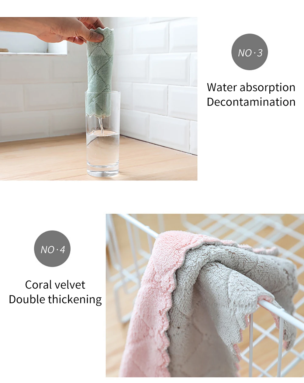 Особенности1. Супер Впитывающая Двусторонняя салфетка для посуды, без масла, чистая и удобная2. Толстый и экологически чистый Корал-флисовый материал, мягкий и удобный, не выцветает и не скатывается ворсом3. Сухая и влажная, хорошая дезактивация; Протирание чистая, легко моется, легко смывается пятнаОсобенностиМатериал: ткань из микрофибрыФорма: квадратнаяРазмер: 27*16 смПосылка входит: 10 салфеток для посуды