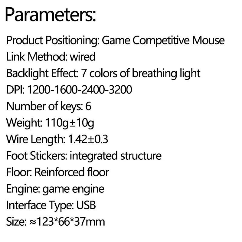 Позиционирование продукта: игровая Конкурентная мышьСпособ соединения: проводнойЗадний светильник: 7 цветов дыхательный светильникDPI: 1200-1600-2400-3200Количество клавиш: 6Провод Длина: 1,42 ± 0,3Наклейки для ног: встроенная структураПол: усиленный полДвигатель: игровой двигательТип интерфейса: USBРазмеры: ≈ 123*66*37 мм