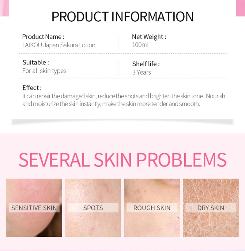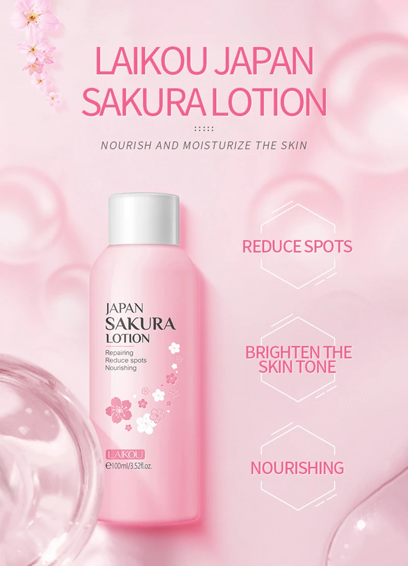 Лосьон LAIKOU Japan Sakura богат экстрактом цветка Prunus Lannesiana и Niacinamide, который может восстанавливать поврежденную кожу, уменьшать пятна и осветлять тон кожи. Он может питать и увлажнять кожу мгновенно, делает кожу более нежной и гладкой.