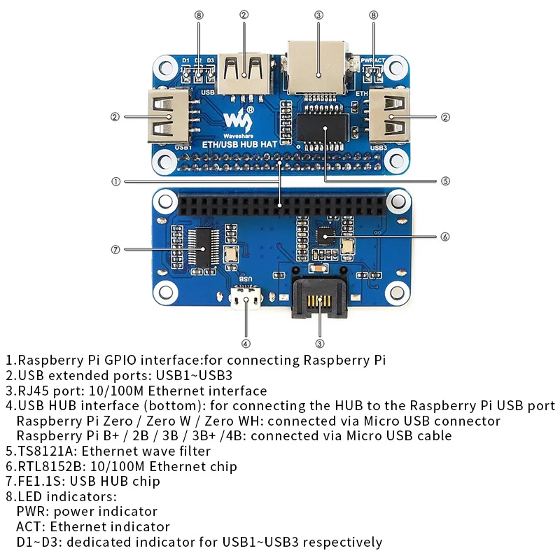 Это плата расширения Raspberry Pi с интегрированными функциями Ethernet и USB концентратора. Шляпа ETH/usb-хаб обеспечивает больше возможностей USB для вашего Pi, а также порт RJ45 Ethernet, который отлично подходит, когда вам нужно стабильное проводное подключение Ethernet. Он может работать с различными версиями Pi, а размер платы идеально подходит для нулевой/нулевой W / Zero WH.