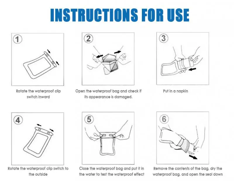 4: после использования в воде, если вам нужно вынуть изделия, пожалуйста, положите уплотнительный рот вниз, чтобы избежать остаточной влаги в водонепроницаемый мешок.