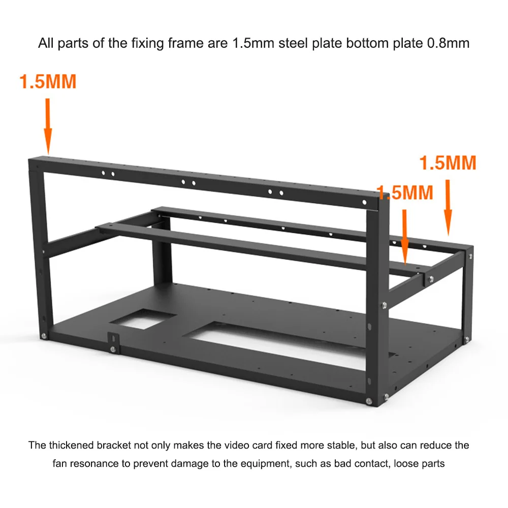 1. Поддержка 6 карт расстояние 81 мм, 8-графика карты интервал: 61 мм.2. Утолщенный кронштейн не только делает графическую карту более стабильной, но и уменьшает резонанс вентилятора, чтобы предотвратить повреждение оборудования.3. Высокая поддержка, увеличение пространства, источник питания и вход CPU воздуха более гладкие, эффективность работы машины выше.4. Красивый, элегантный, держит машину идеально организованной, в то время как она держит меньшее количество тепла возможно.5. Держите все кабели чистыми и организованными, а также все в вашей шахтерской машине.Спецификация:Тип изделия: открытая шахтная рамаРазмер: 500x240x268ммПрименимый Размер материнской платы: максимум 305x245ммВидеокарта: длина видеокарты не ограничена, поддержка 6GPU81MM, 8GPU расстояние 61 ммРадиатор: ЦП радиатор Высота 95 ммПоддержка источника питания: Поддержка источника питания ATX, поддержка расширенного источника питанияУстройство хранения: SSDX2 + HDDX1Характеристики вентилятора: вентилятор X4 12 смМатериал: кронштейн 1,5 мм, нижняя пластина 0,8 мм, поверхность дарит ощущение еще опрыскивают песок сандалии с натуральным лицевым покрытием черного цветаСтандартные винты: шестигранная колонна 9 шт., винт для материнской платы 11 шт., шестигранный винт 26 шт.(Неподвижная стойка 12 шт., фиксированная видеокарта 8 шт., стационарный источник питания 4 шт.)Запасные части продукта: 1 x кронштейн видеокарты, 1 x крепежный кронштейн видеокарты, 2 x левый и правый кронштейн, 1 x Задний крепежный зажим, 1 x Базовая пластина, 1 x Блок питания для крепления)Примечание:-Возможны небольшие погрешности в размере при ручном измерении.-Из-за различных эффектов освещения и настроек монитора фактический цвет товара может не точно отражать цвет на фотографиях.
