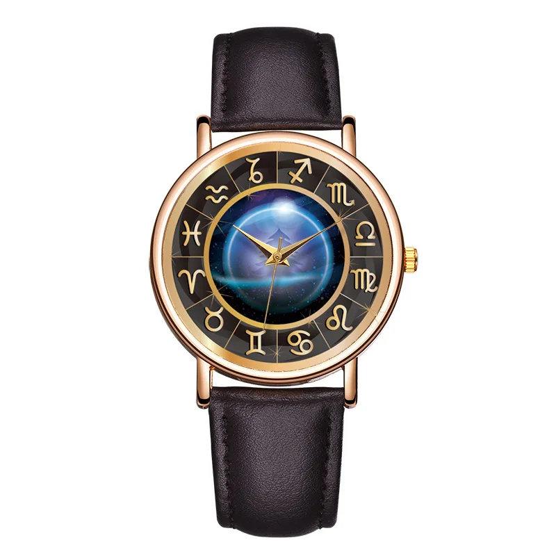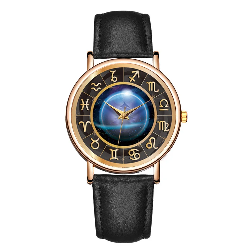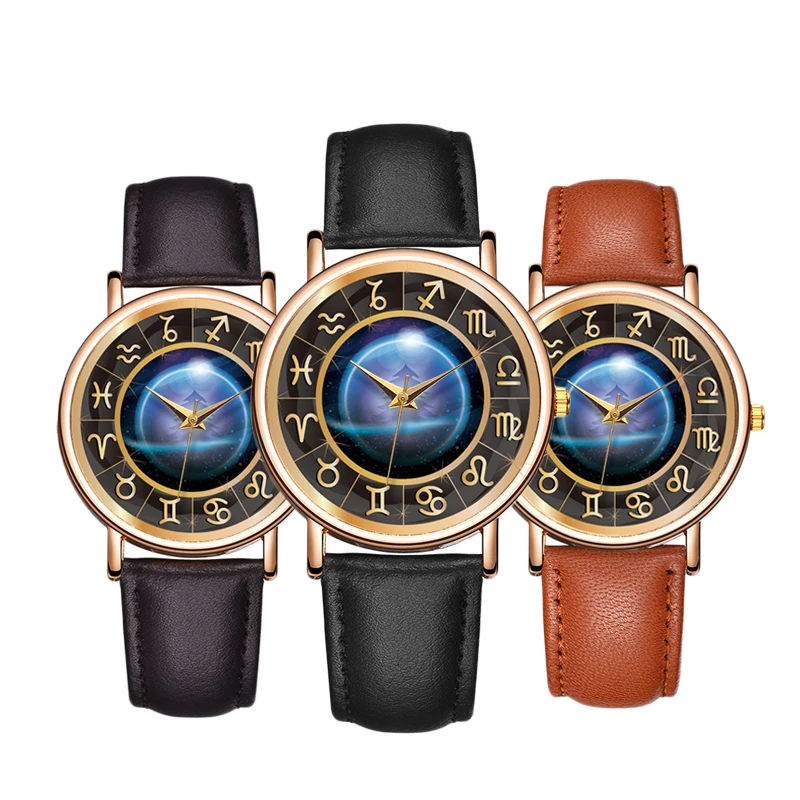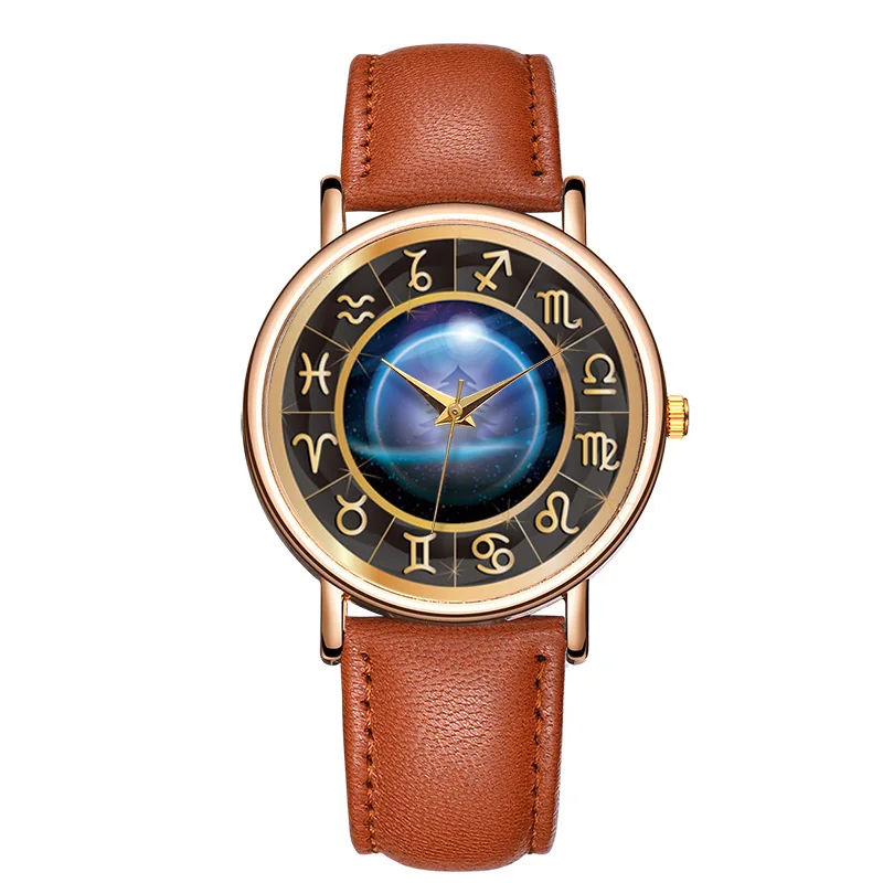 Часы женские кварцевые, с кожаным ремешком, с изображением двенадцати созвездий звездного неба