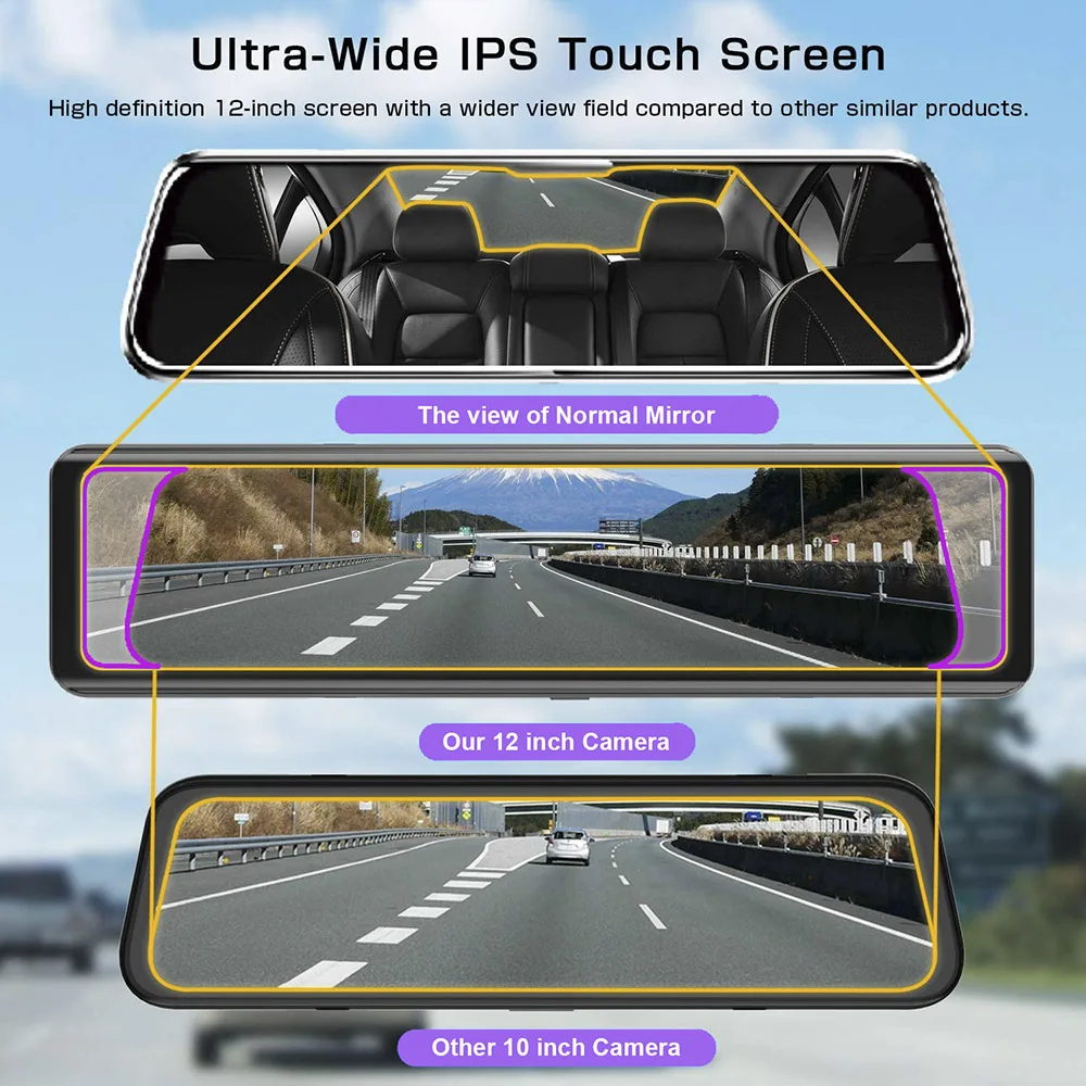 12-дюймовый Полноэкранный сенсорный экран обеспечивает Кристальное изображение без задержек. Очень четкий и плавный показ изображения, как поток, текущий на отличном WDR и автоматическая регулировка яркости потокового зеркала.