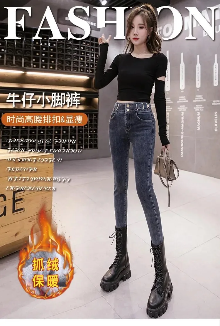 Зимние плотные бархатные женские джинсы с высокой талией, облегающи...