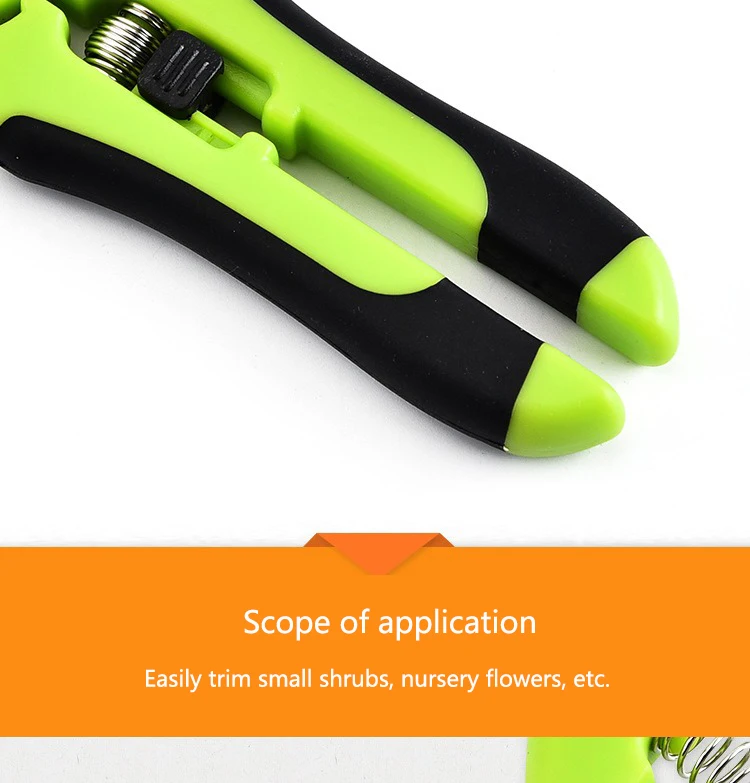 Параметры продуктаНомер товара: GT41Модель: orange, зеленыйИспользование: СадоводствоФорма: прямаяМатериал: ручка PP + TPR, лезвие 2CR13Полная длина: 165 (мм)Размер отверстия: 45 (мм)Примечание: цвет товара будет отправлен случайным образом