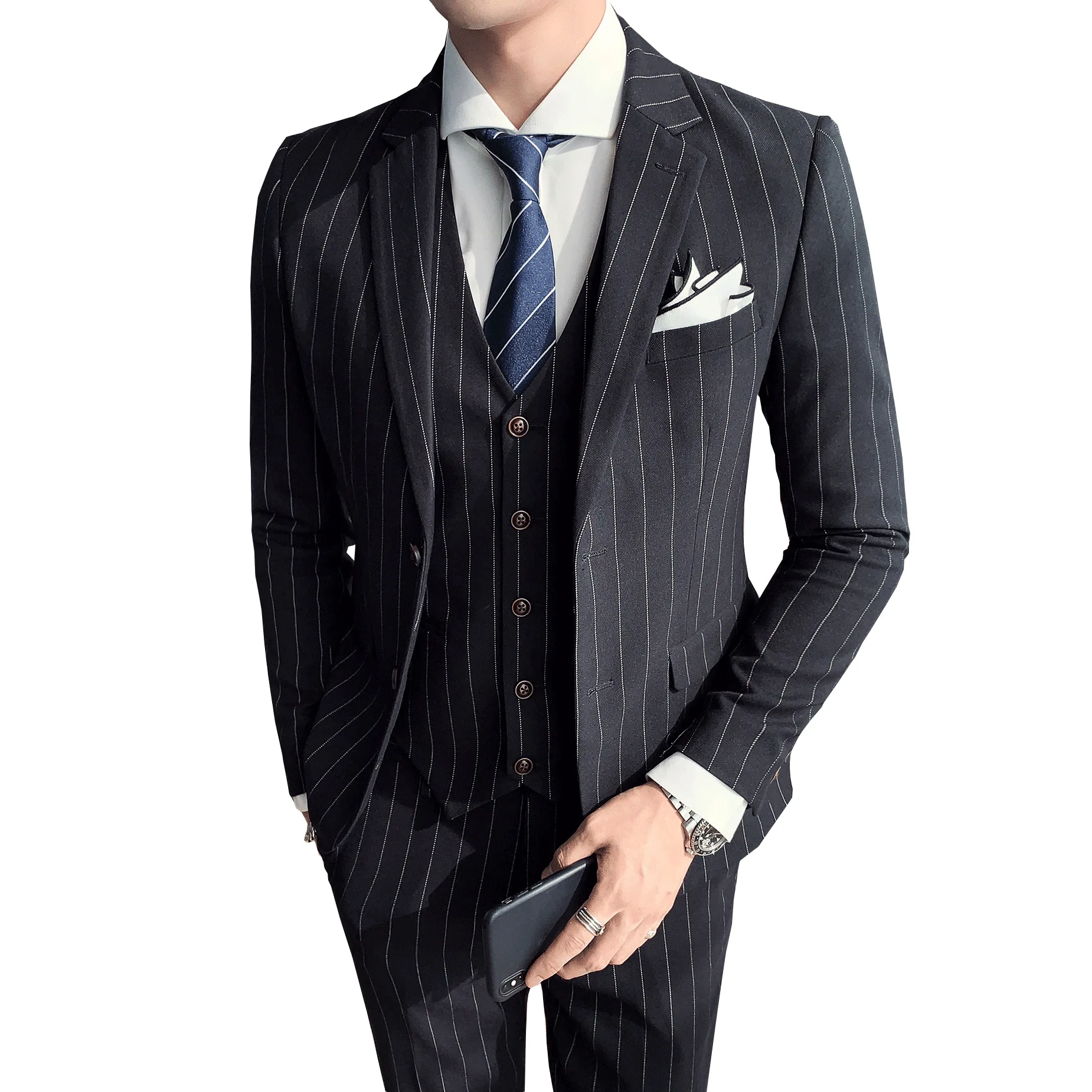 Мужские костюмы в полоску в Корейском стиле, облегающий деловой костюм-тройка с двумя пуговицами