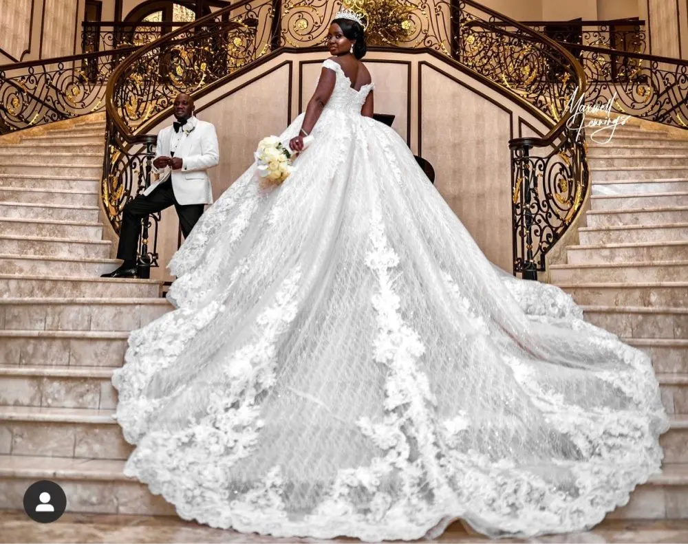Свадебное платье с открытыми плечами, Кружевная аппликация в стиле ретро