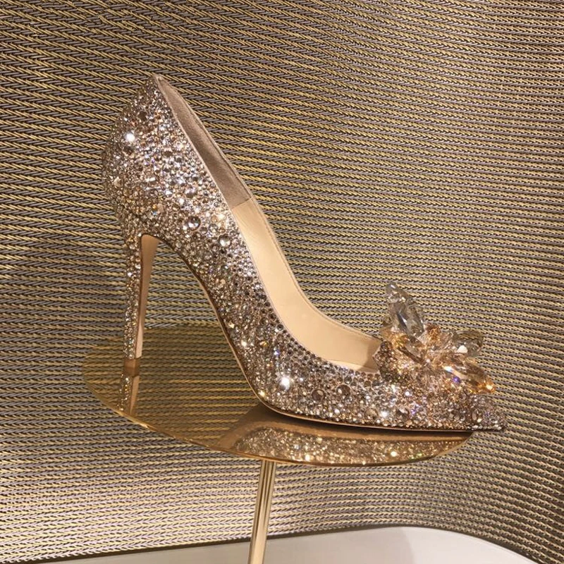 Женские туфли-лодочки с острым носком, роскошные дизайнерские свадебные туфли на высоком каблуке, с кристаллами, розового золота, Золушка