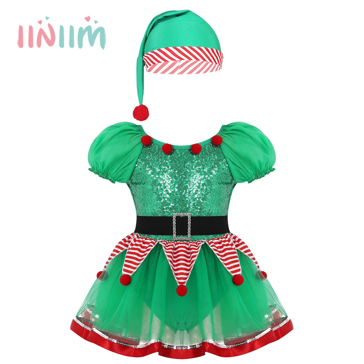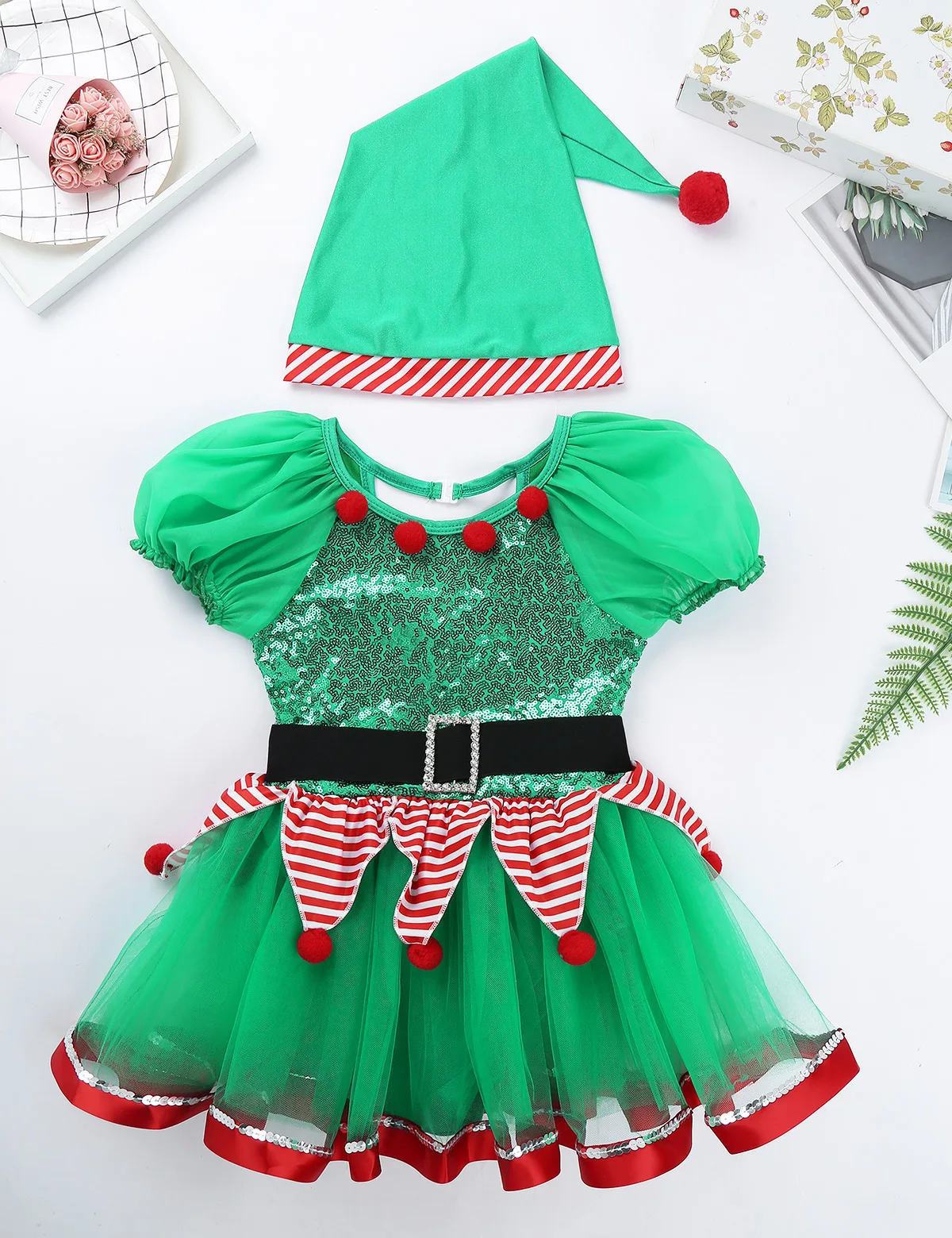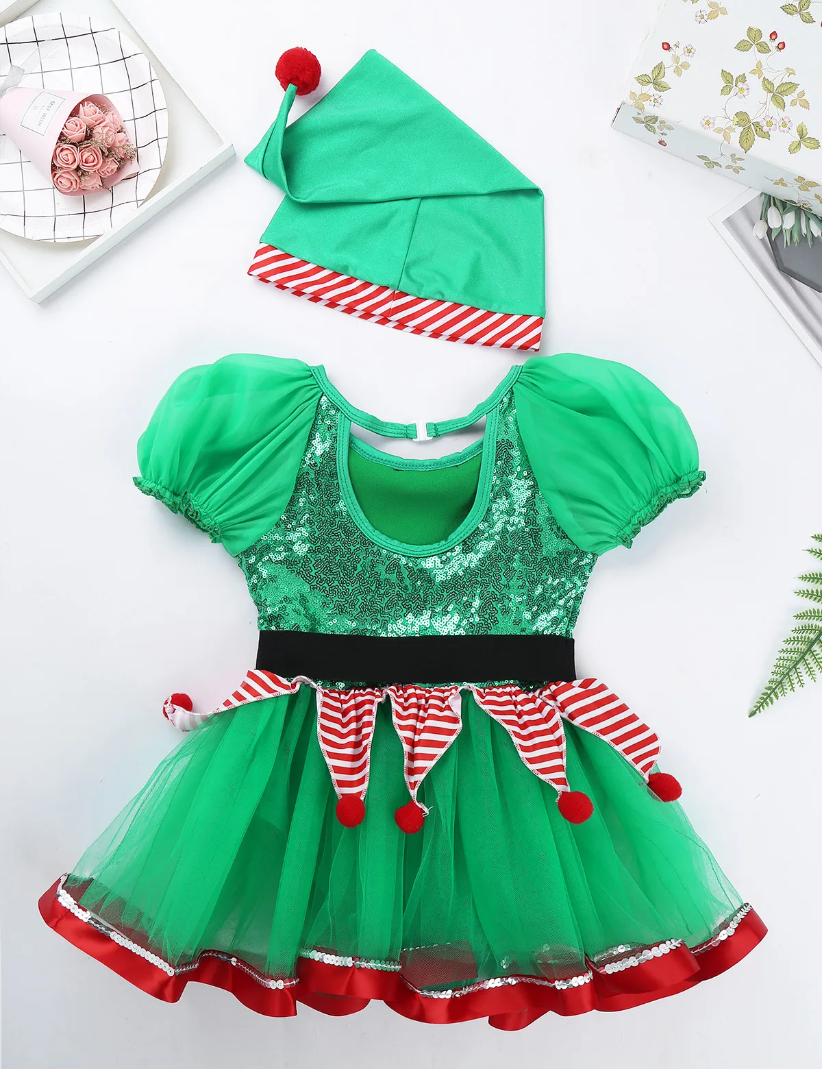 Рождественское платье для девочек elf, праздничный костюм Санта-Клауса, наборы для девочек, новогоднее платье с пышными рукавами и блестками для рождевечерние