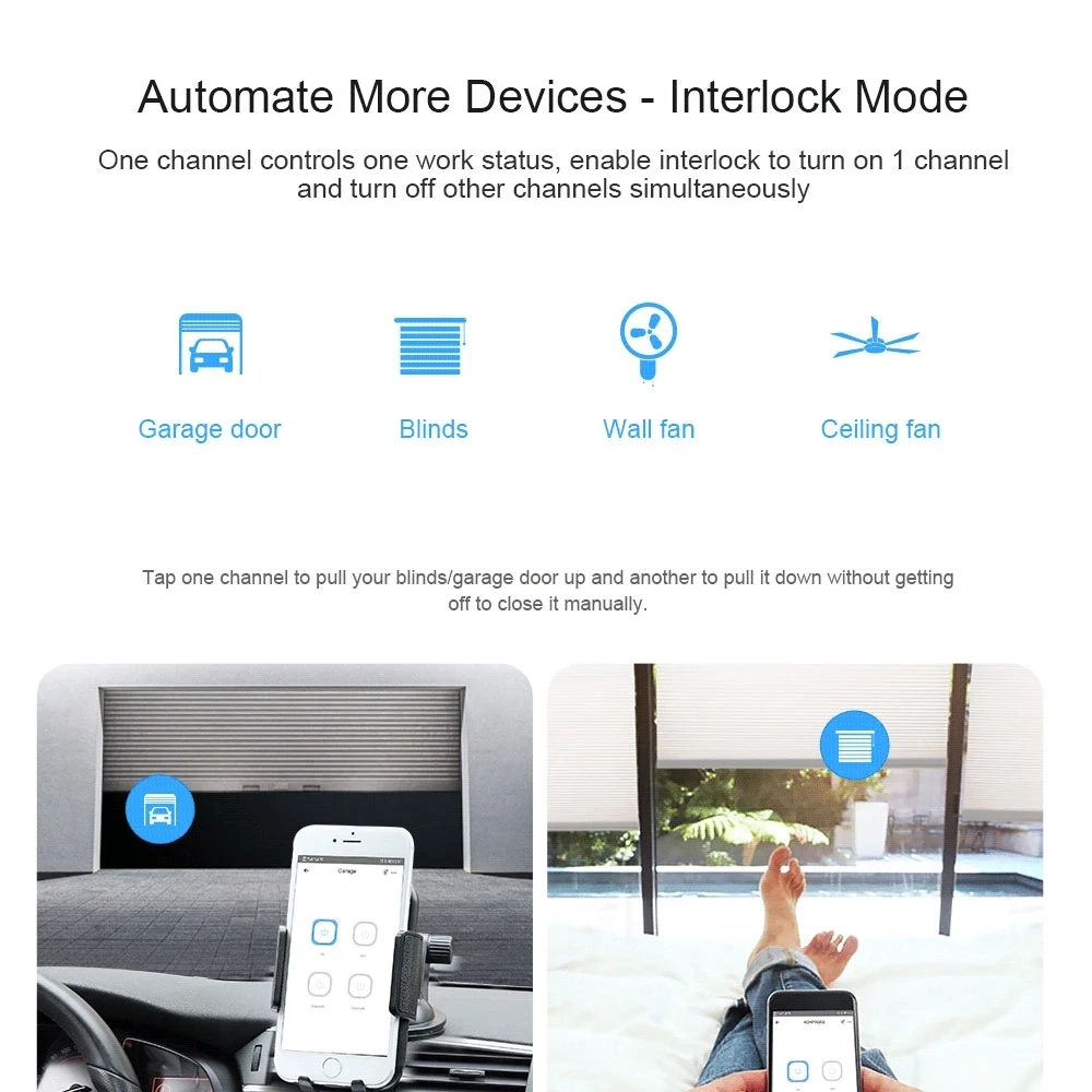 RF контроль:4CHPROR3 разработан с дополнительной функцией управления RF. Функция предназначена для того, чтобы включить/выключить устройство, подключенное к 4CHPROR3 с помощью пульта дистанционного управления RM433.3 режима работы:Различные в 3 рабочих режимах, включая самоблокирующийся, блокирующий и инширующий режим. Новое улучшение на 4CHPROR3 по сравнению с 4CHPROR2 для пользователей установить эти 3 рабочих режима на приложение eWeLink вместо самого оборудования, проще в эксплуатации. Таким образом, вы можете включить режим самоблокировки для включения/выключения 4 подключенных устройств отдельно, кирпечей из глины режим, чтобы включить 1 подключенного устройства в любое время и выключается остальную часть устройства одновременно и автофиксацией/шаговым управлением режим, чтобы включить 1 подключенного устройства, а затем он выключается автоматически после того, как тот или иной момент времени (0,5-3600s).