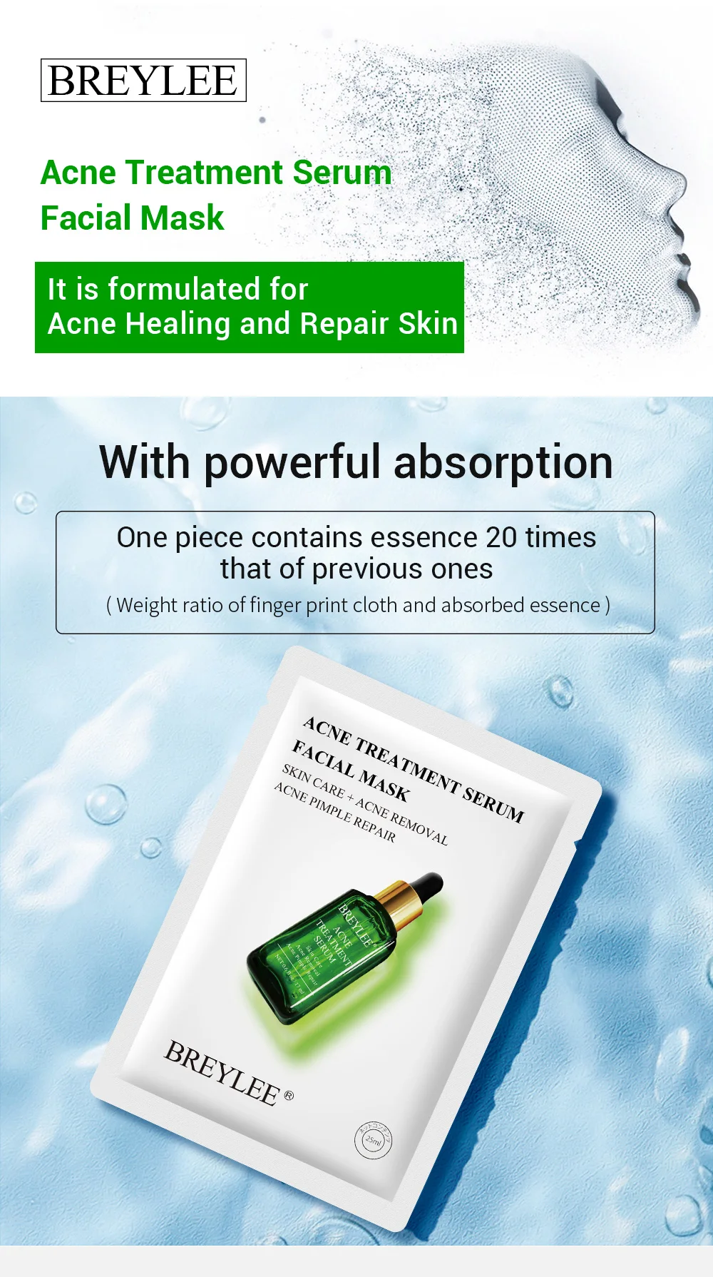 Сыворотка для лечения акне BREYLEE маска для лица разработана для лечения акне и восстановления кожи с мощным поглощением одна штука содержит эссенцию в 20 раз больше, чем у предыдущих (соотношение веса ткани для печати пальцев и впитываемой эссенции) обезвоживание может вызвать различные проблемы с кожей повторные акне жирное лицо упрямый акне знак