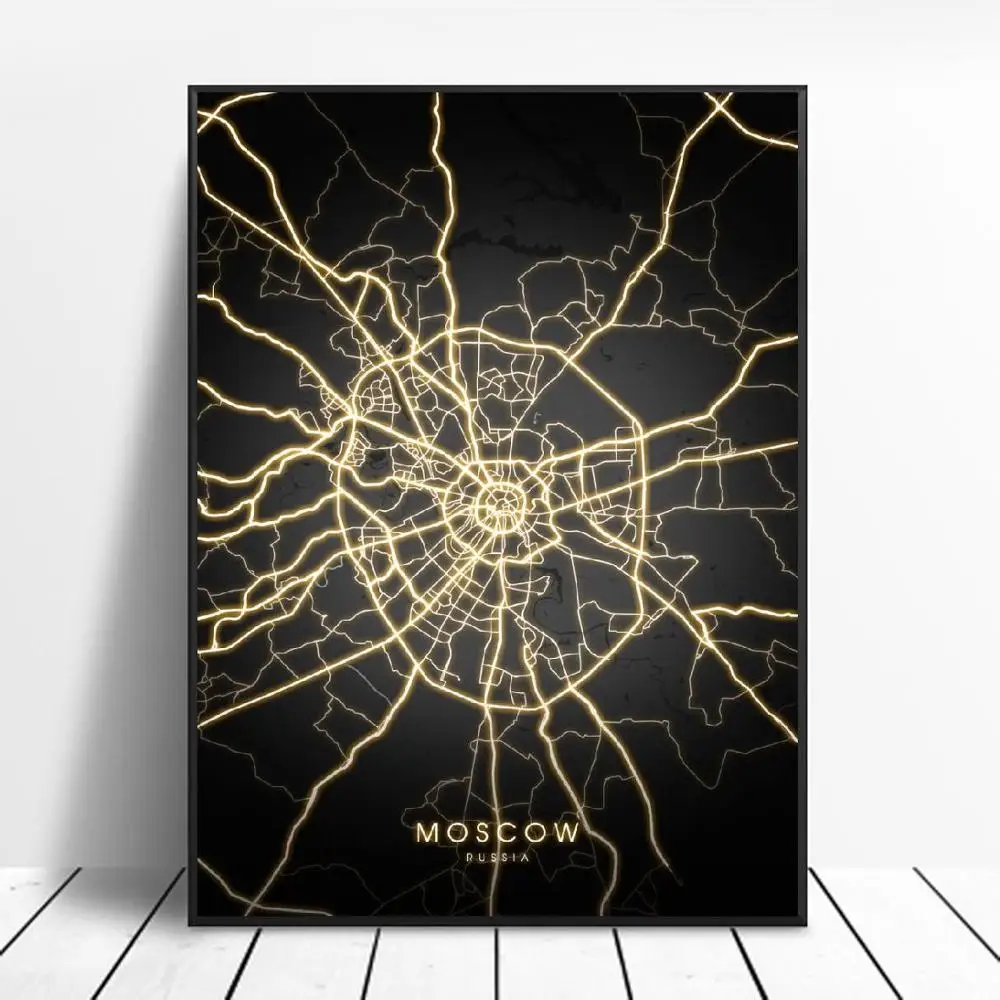 Настенная картина для гостиной, домашний декор, Казань, Москва, Санкт-Петербург, Россия, черный и золотой Холст, художественная карта, постер