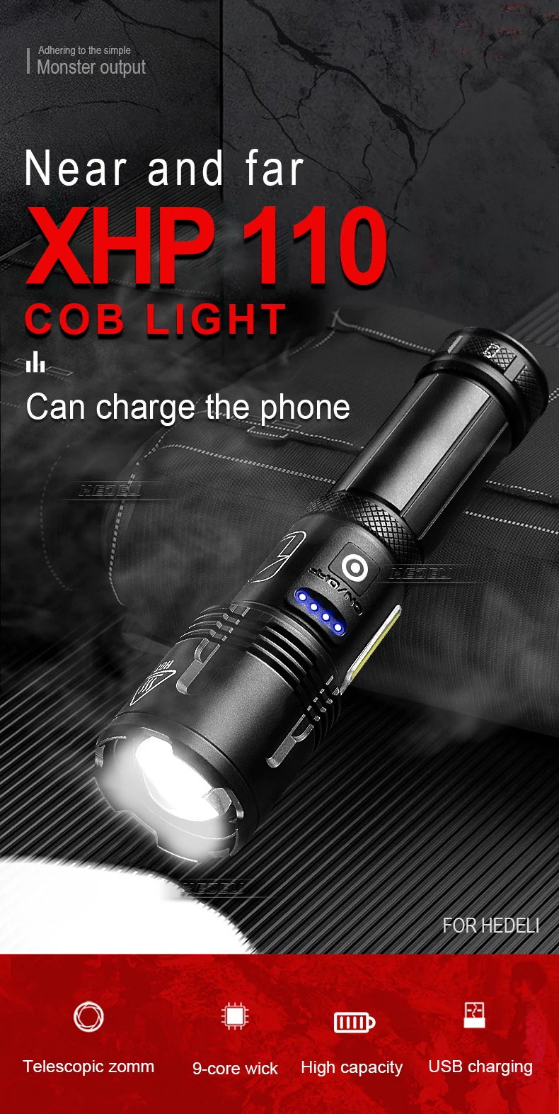 1. Самый мощный тактический фонарик, с помощью XHP110 и COB светодиодный фитиль, максимальная мощность может достигать 500000 люмен2. Быстрый двойной щелчок для включения COB светильник, есть красный и белый светильник3. Изготовлен из авиационного алюминиевого сплава, прочного военного анодированного алюминия4. Вход Micro USB, удобный для зарядки в различных средах5. Используйте аккумуляторы 18650 или 26650. Внутренняя проводка использует высокоэффективную схему повышения для максимального использования аккумулятора.