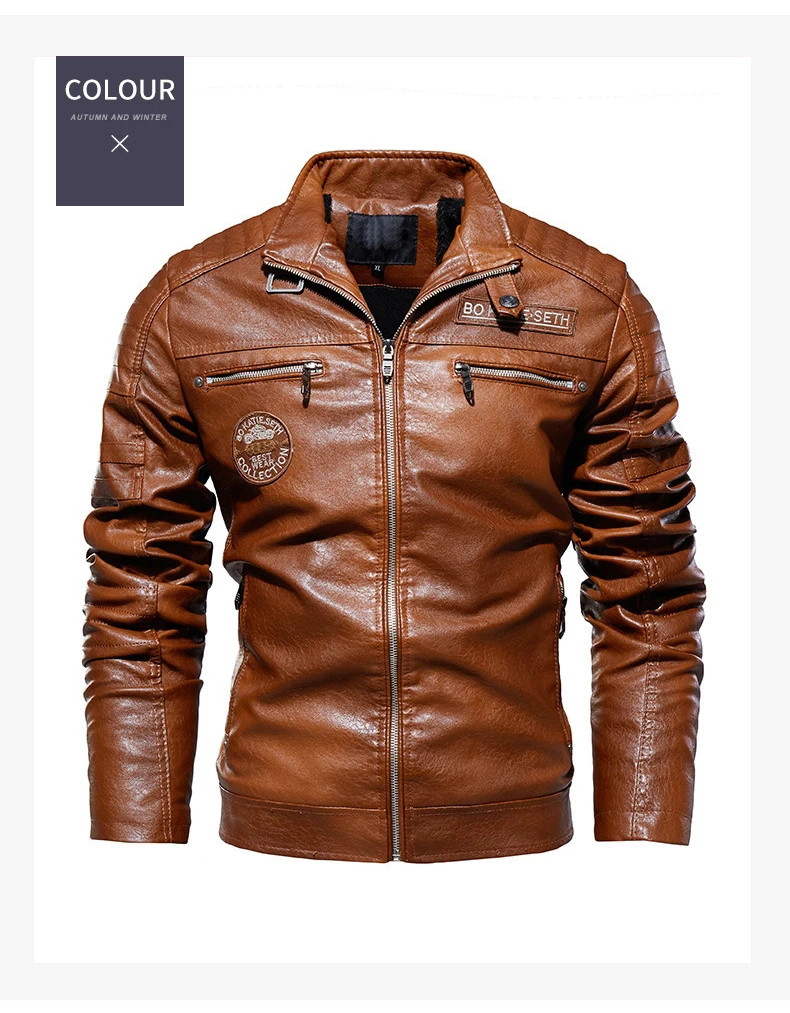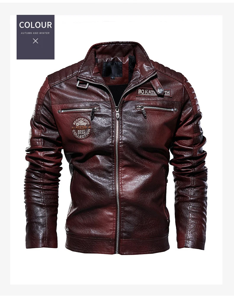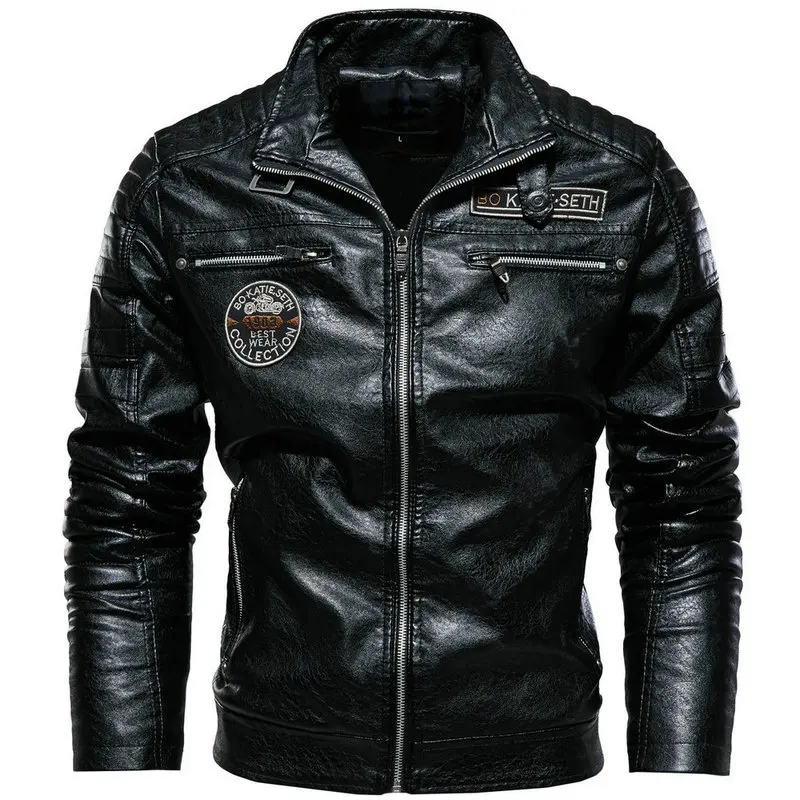 Мужская куртка из ПУ кожи, с флисовой подкладкой и воротником-стойкой