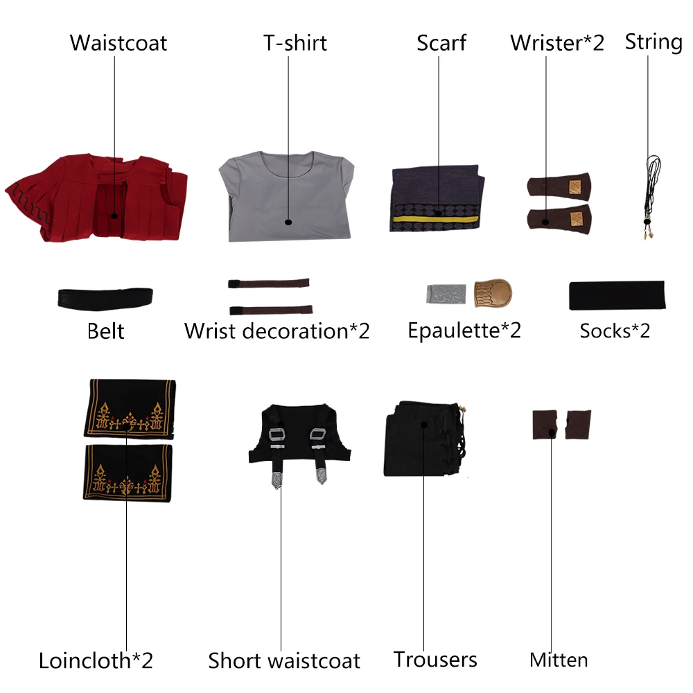 Посылка включает:Жилет, футболка, брюки, шарф, тканевая ткань, короткий жилет, wrister * 2, стринги, ремень, украшение на запястье, epaulette * 2, носок * 2, варежки