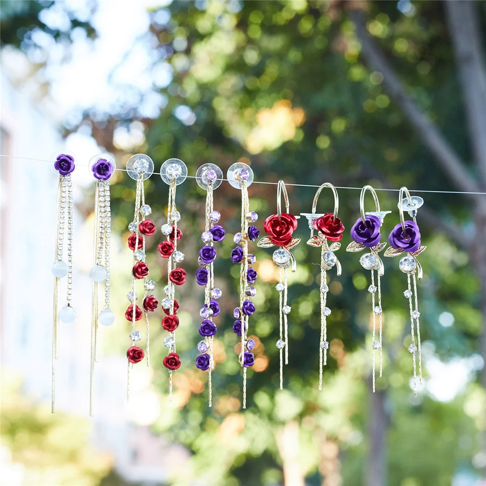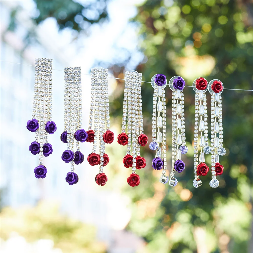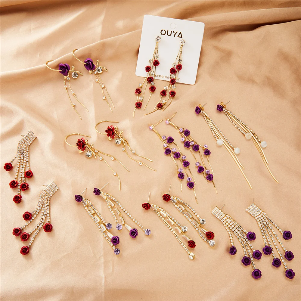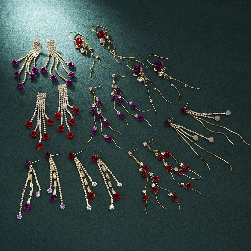 Модные висячие серьги с красными лепестками роз для женщин, длинные висячие серьги фиолетового и розового золота с кисточками, украшения для свадебной вечеринки, украшения для ушей