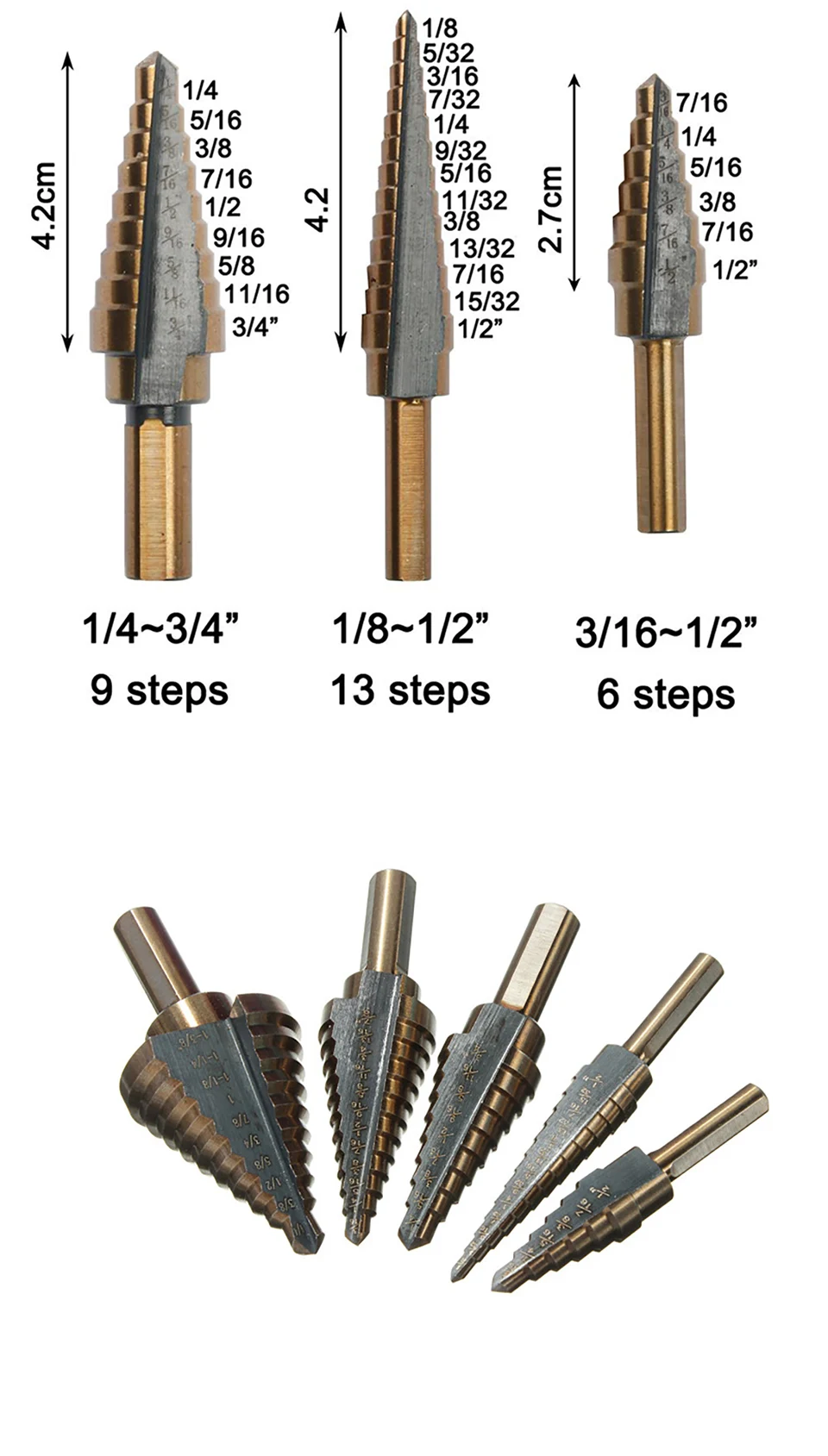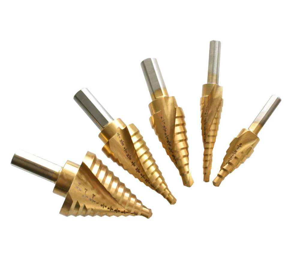 Набор ступенчатых сверл включает в себя пять стандартных ступенчатых Сверл из быстрорежущей стали, которые могут заменить 50 отдельных сверл. Сверло может использоваться в качестве замены нескольких сверл для удовлетворения различных потребностей. С помощью пяти ступенчатых сверл, которые мы предлагаем, вы можете обработать 50 различных видов отверстий по диаметру, что значительно экономит вам много хлопот и места. Это означает, что 50 размеров уплотнены в пять, что делает сверление более простым и практичным.