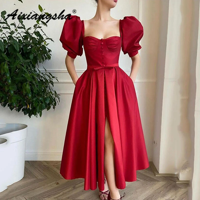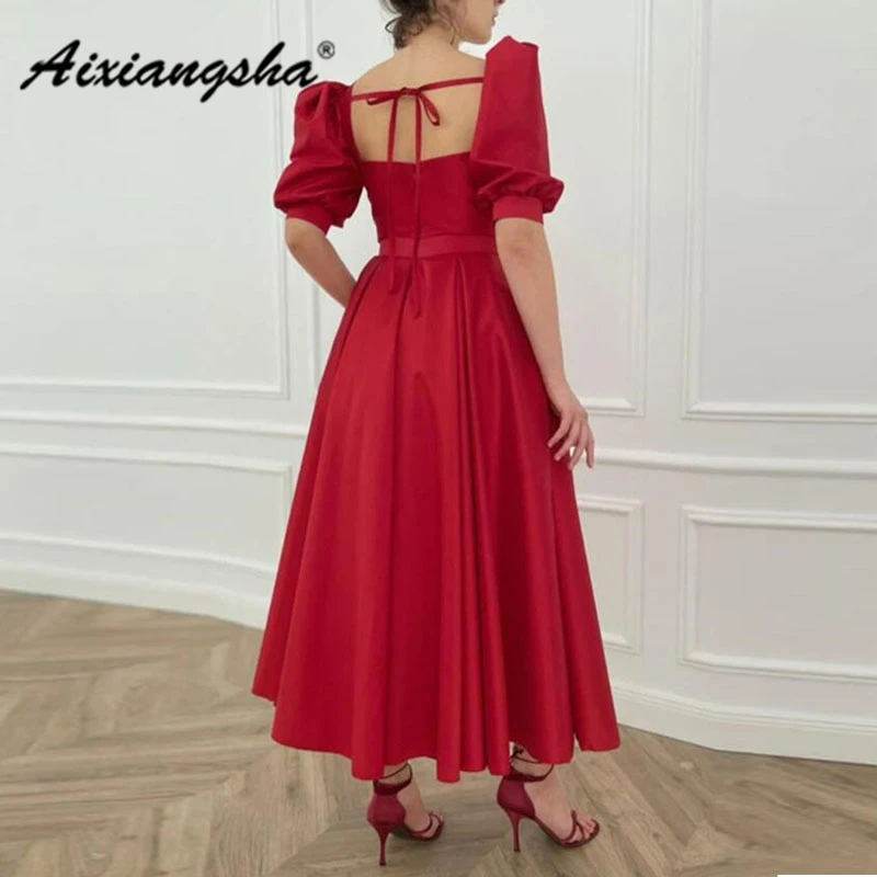Красное вечернее платье Aixiangsha, платье принцессы во французском стиле с квадратным вырезом, пуговицами, рукавами до локтей, бантом на поясе