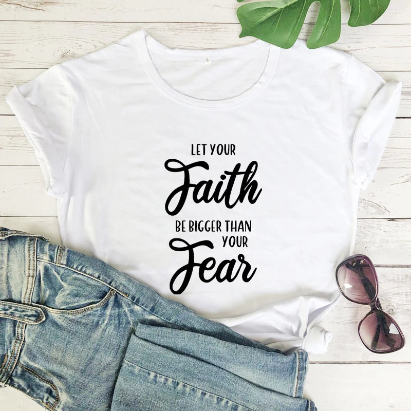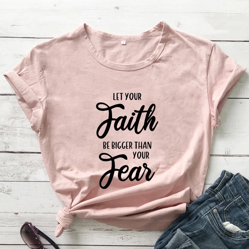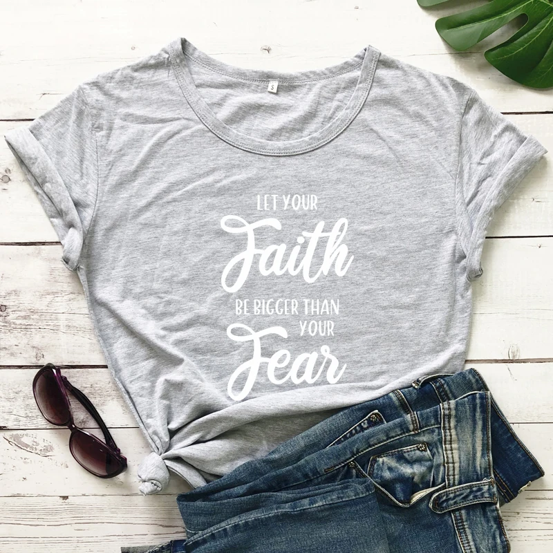 Женская футболка с надписью Пусть ваша вера будет больше вашего страха, Женская Религиозная Христианская Библия, Повседневная молитвенная футболка для церкви, Топ