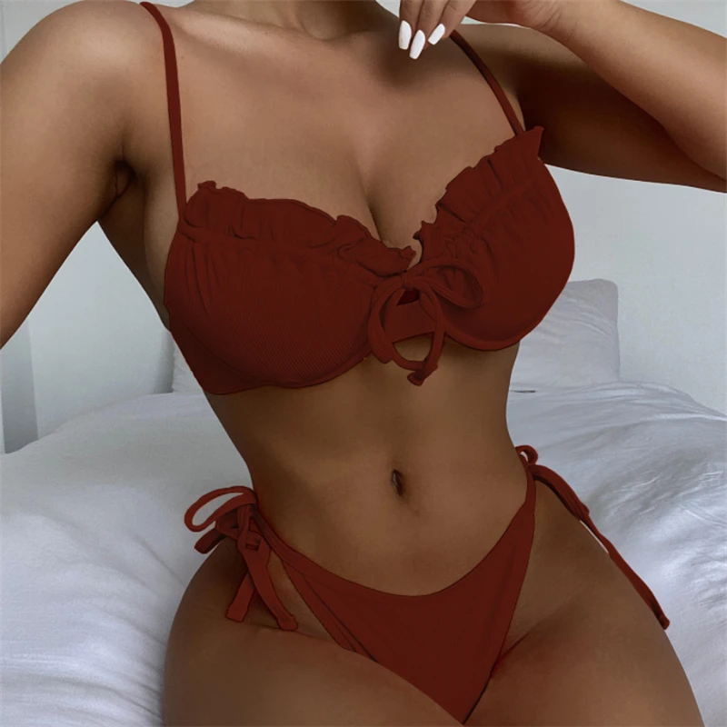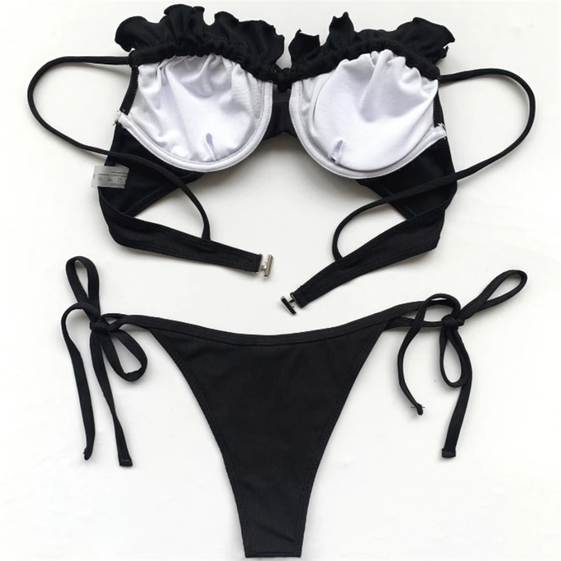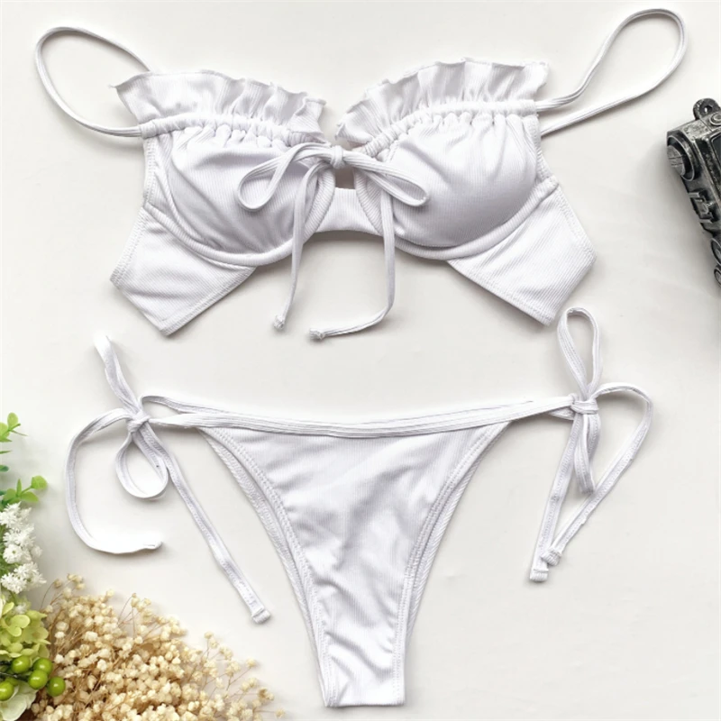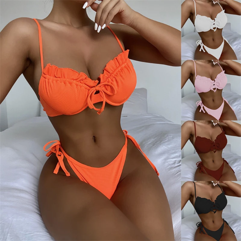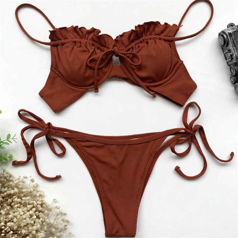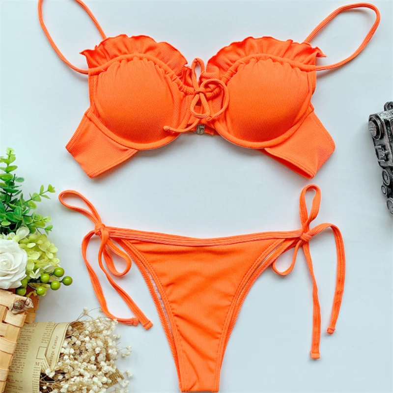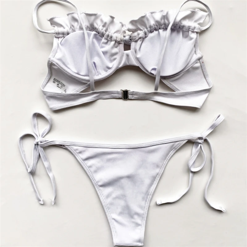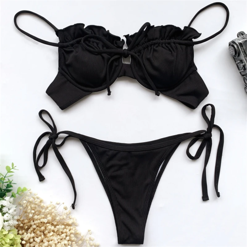 Купальник-бикини женский летний однотонный с рюшами и эффектом пуш-ап