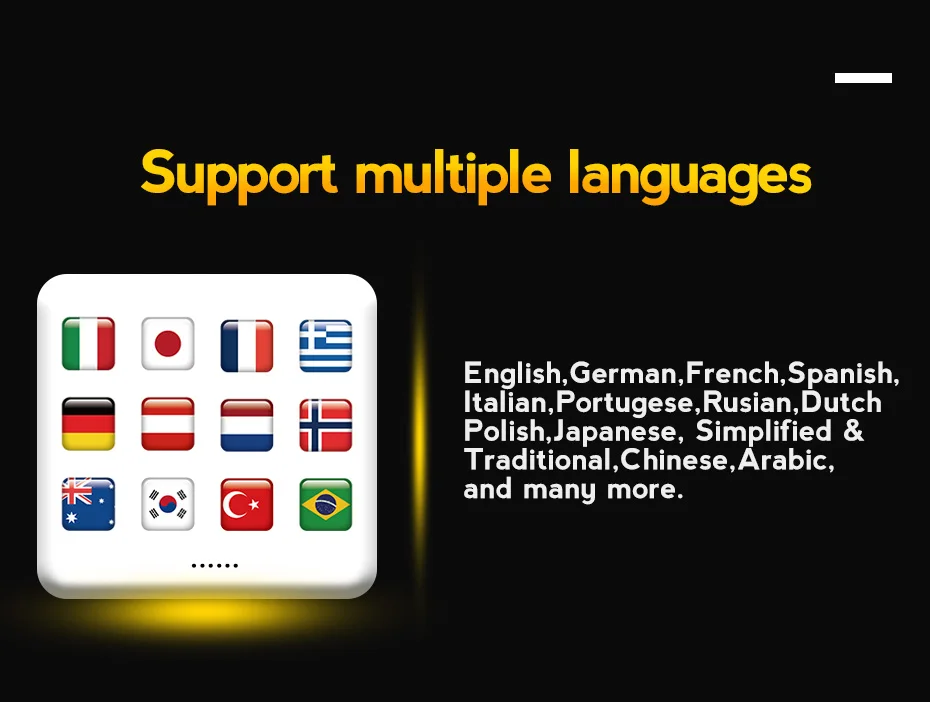 Русский, английский, испанский, итальянский, французский, чешский, арабский, немецкий, иврит, китайский, эстонский, польский, филиппинский, финский, корейский, голландский, хорватский, латышский,
