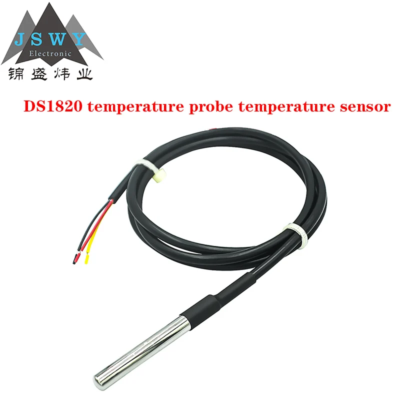 Высококачественная посылка из нержавеющей стали, водонепроницаемая, влагостойкая и устойчивая к ржавчинеКорпус из нержавеющей стали (6*50 мм), длина свинца 100 смИсточник питания 3,0 V ~ 5,5 V9 ~ 12 бит Регулируемое разрешениеШирокий диапазон температур-55 ℃ ~ + 125 ℃Нет необходимости в внешних компонентах, уникальный интерфейс одной шиныВыход: красный (VCC), желтый (DATA), черный (GND),