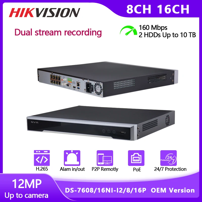Hikvision 8CH 16CH NVR с двойной потоковой записью OEM DS-7608NI-I2/8P DS-7616NI-I2/16P POE сетевой видеорегистратор 12mp IP камера