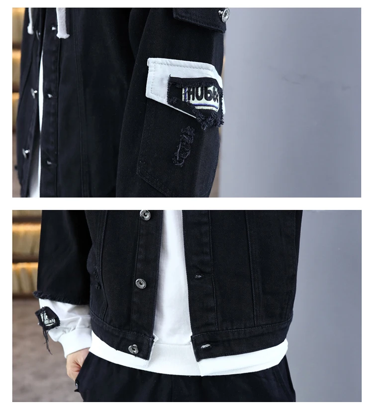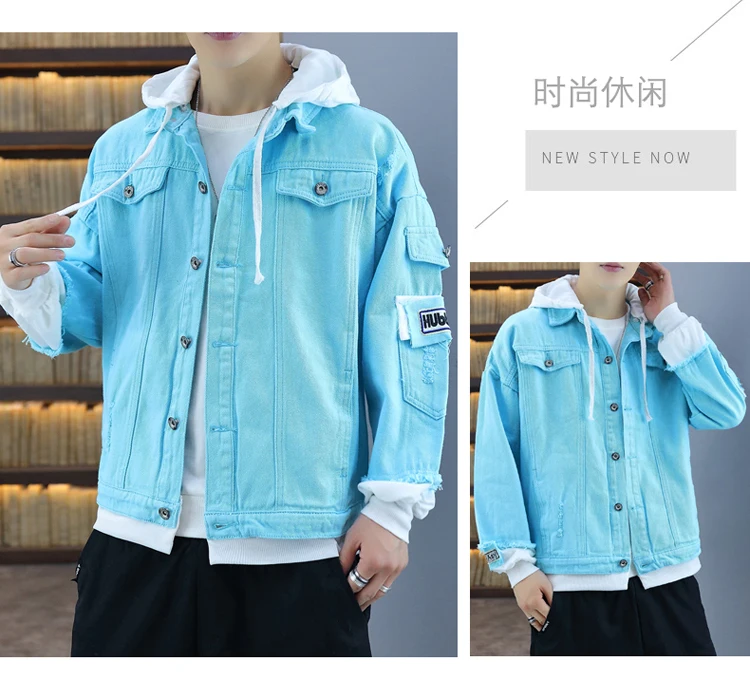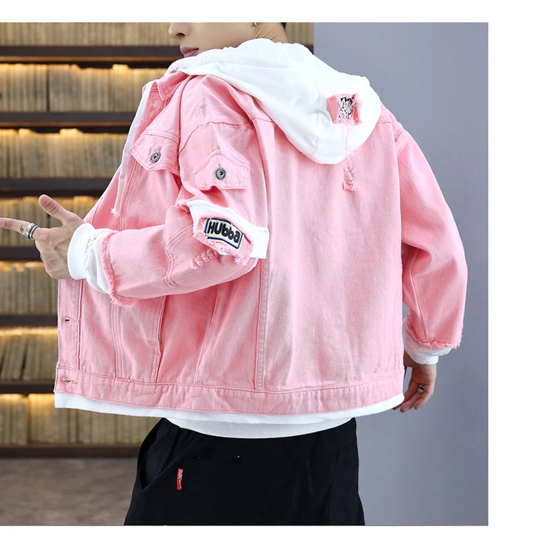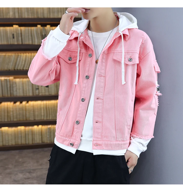 Мужская Осенняя джинсовая куртка с капюшоном, розовая хлопковая куртка из денима с дырками, уличная одежда, верхняя одежда