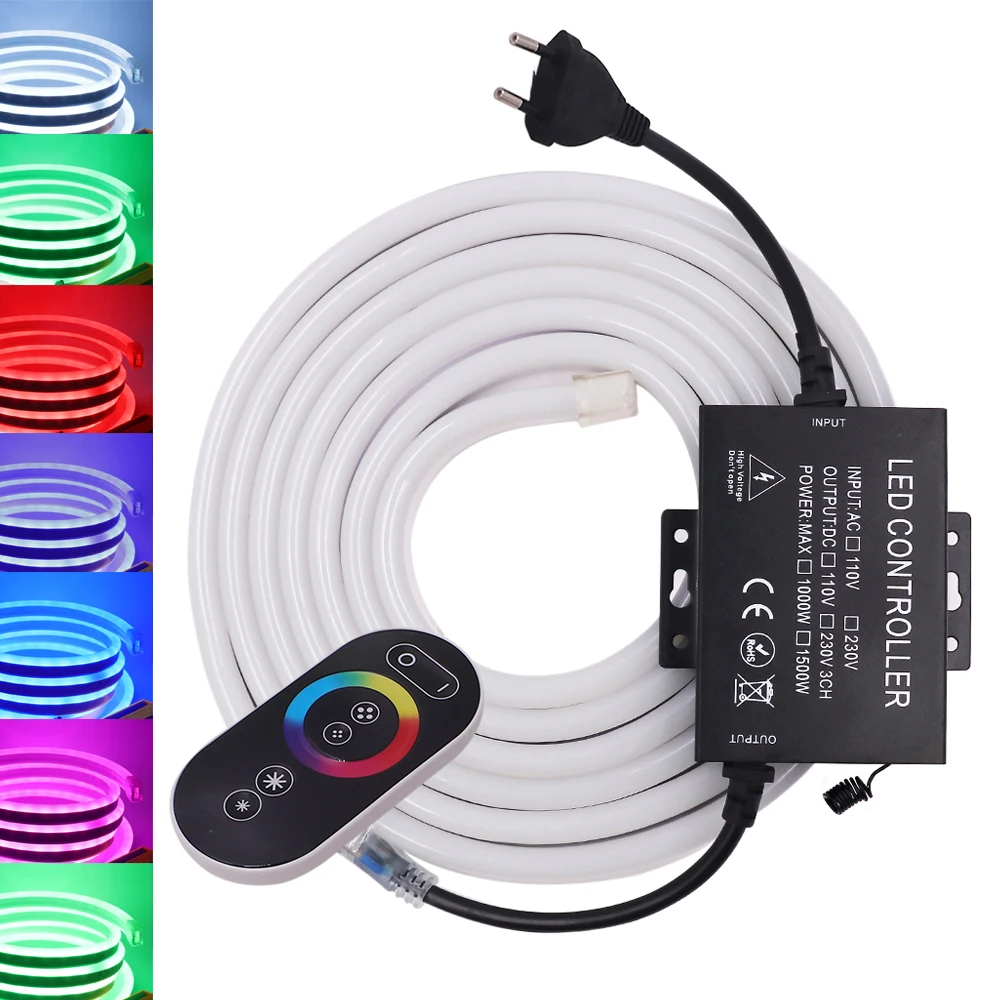 Неоновая лента RGB, 220 В переменного тока, 110 В, водонепроницаемая, контроллер ЕС, США, Австралии, Великобритании + сенсорный пульт дистанционного управления, ночная лампа, гибкая лента, SMD 5050, светодиодная лента