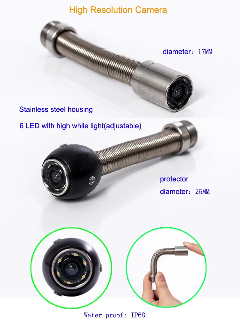 Головка камеры 17 ммДиаметр камеры: 17 ммС диаметром трубки: 18-100 ммКамера светильник источник света: 6 светодиодный с высоким уровнем белого светильник (регулируемый)Рабочее напряжение камеры: 5 ВРабочее напряжение освещения: 12 ВВодонепроницаемость: IP68Материал камеры: нержавеющая стальРазмер камеры: 100 мм * 17 ммДетали защитной крышки камеры Материал: металлЗащитная крышка для камеры Размер деталей: 20 мм * 25 мм