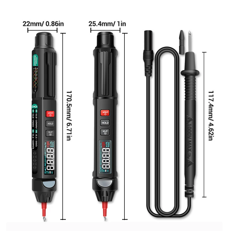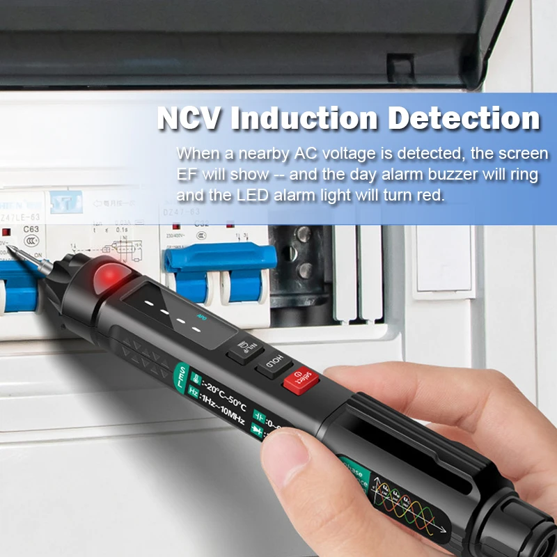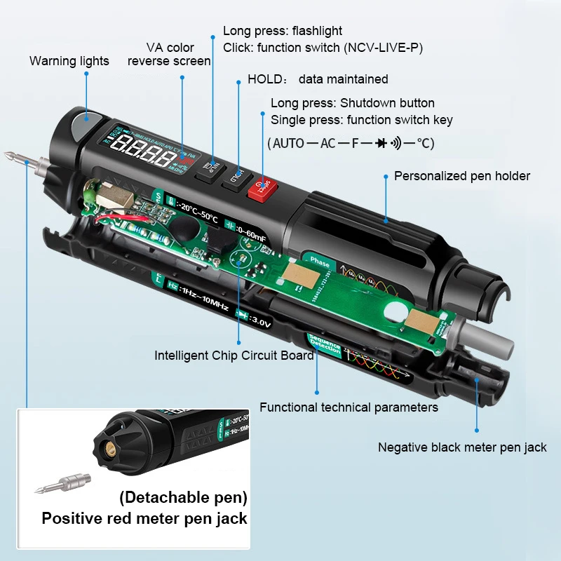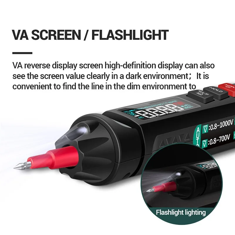 Особенности:** Изготовлен из высококачественных материалов, хорошего качества и длительного использования.** Экран высокой четкости, удобный для наблюдения за данными.** С фонариком, он может использоваться в ночное время и имеет широкий спектр использования.** Измеренное значение может быть сохранено на экране, что упрощает запись значения.** Дизайн зажима ручки, можно закрепить на одежде, маленький размер, легко носить с собой.** Подходит для технического обслуживания, строительства, железной дороги и т. д., с широким спектром использования.** Интеллектуальная идентификация нулевой линии огня, Бесконтактное измерение, безопаснее в использовании.